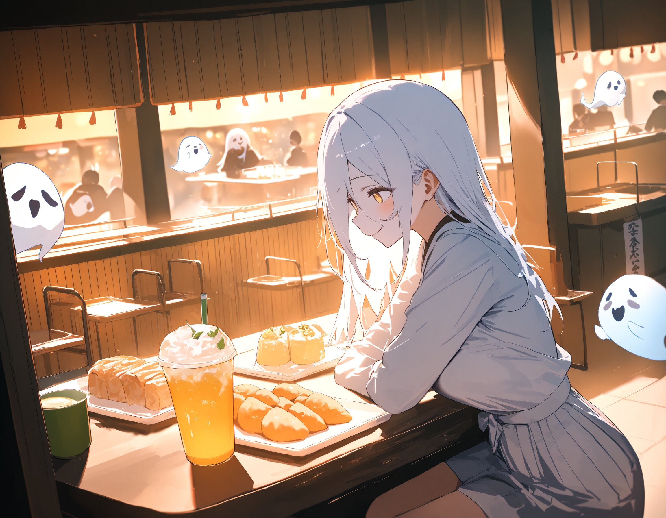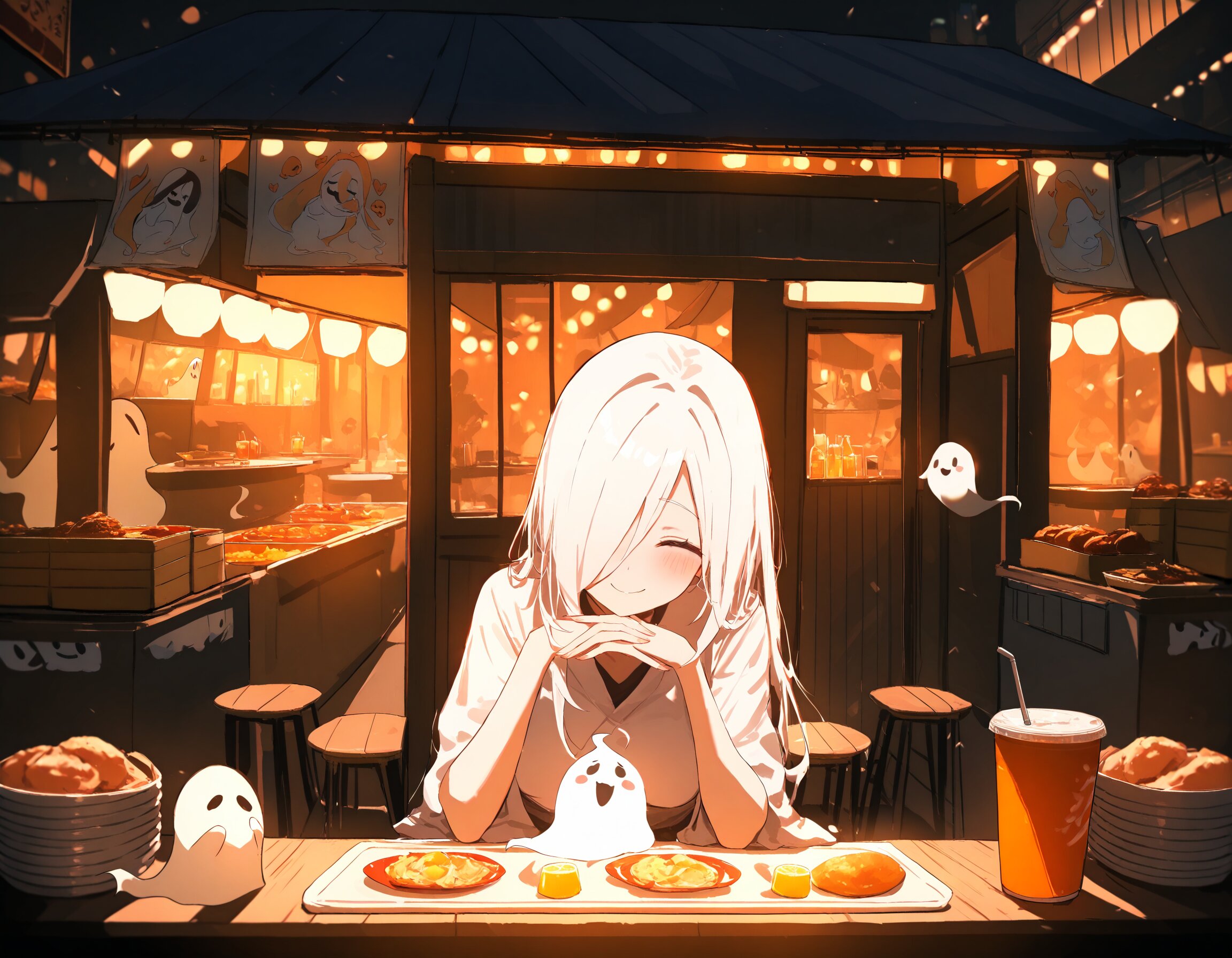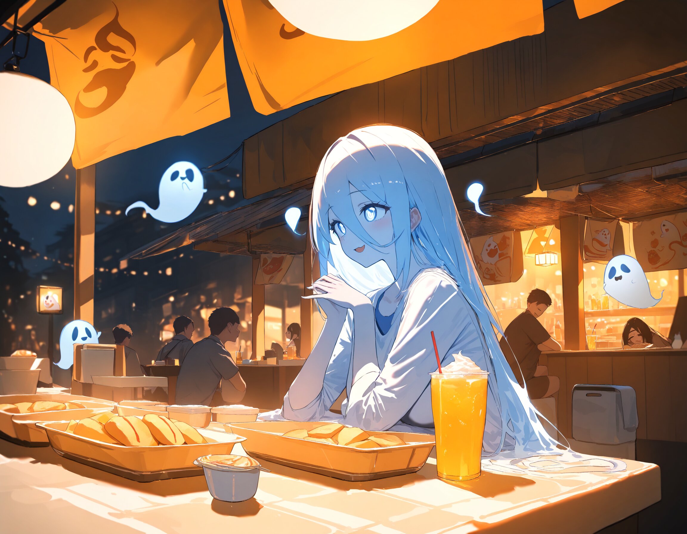 ghost girl, cute ghost, funny ghost, food court, food stand, market stall, food, drink, plastic tables, warm lighting, playful and heartwarming, highly detailed, masterpiece, high score, great score, absurdres