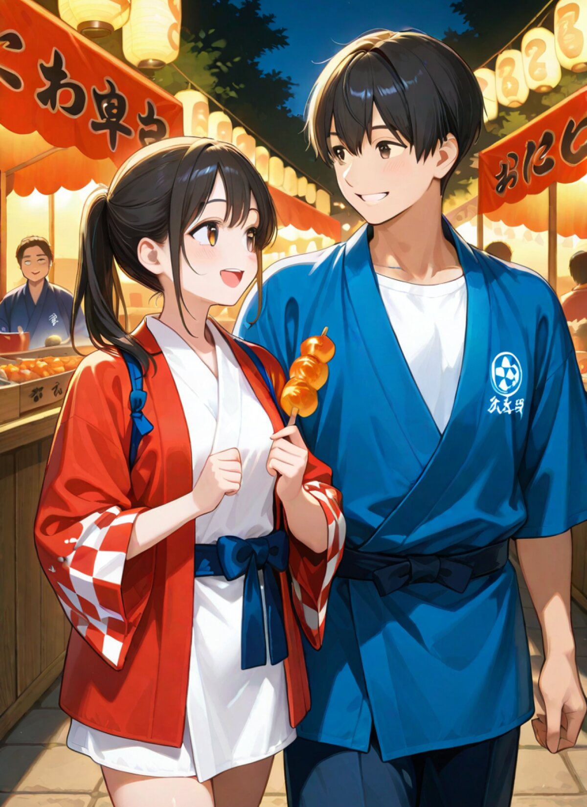 日本の法被を着た女の子と日本の法被を着た男の子、お祭り、夜店、屋台、デート、