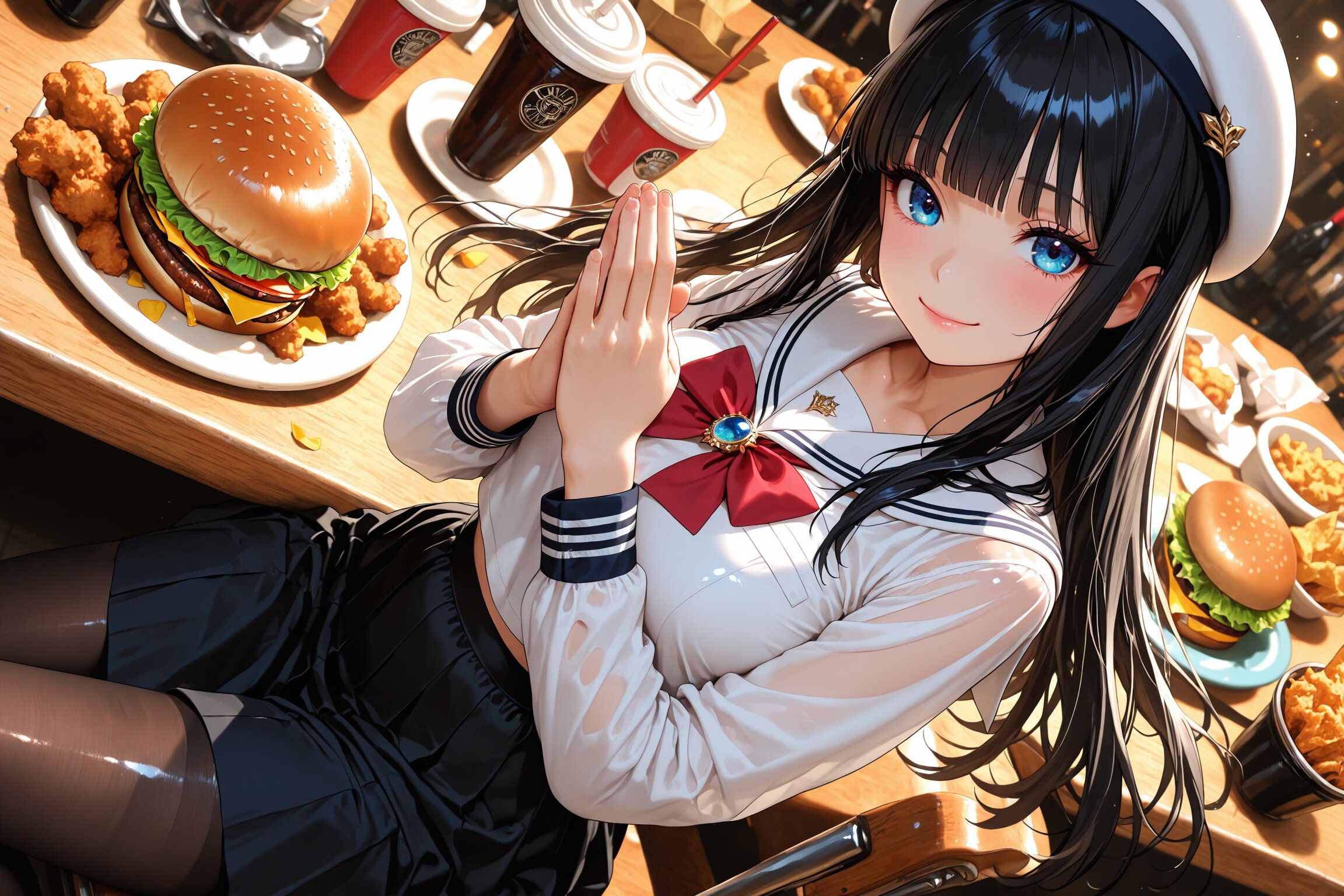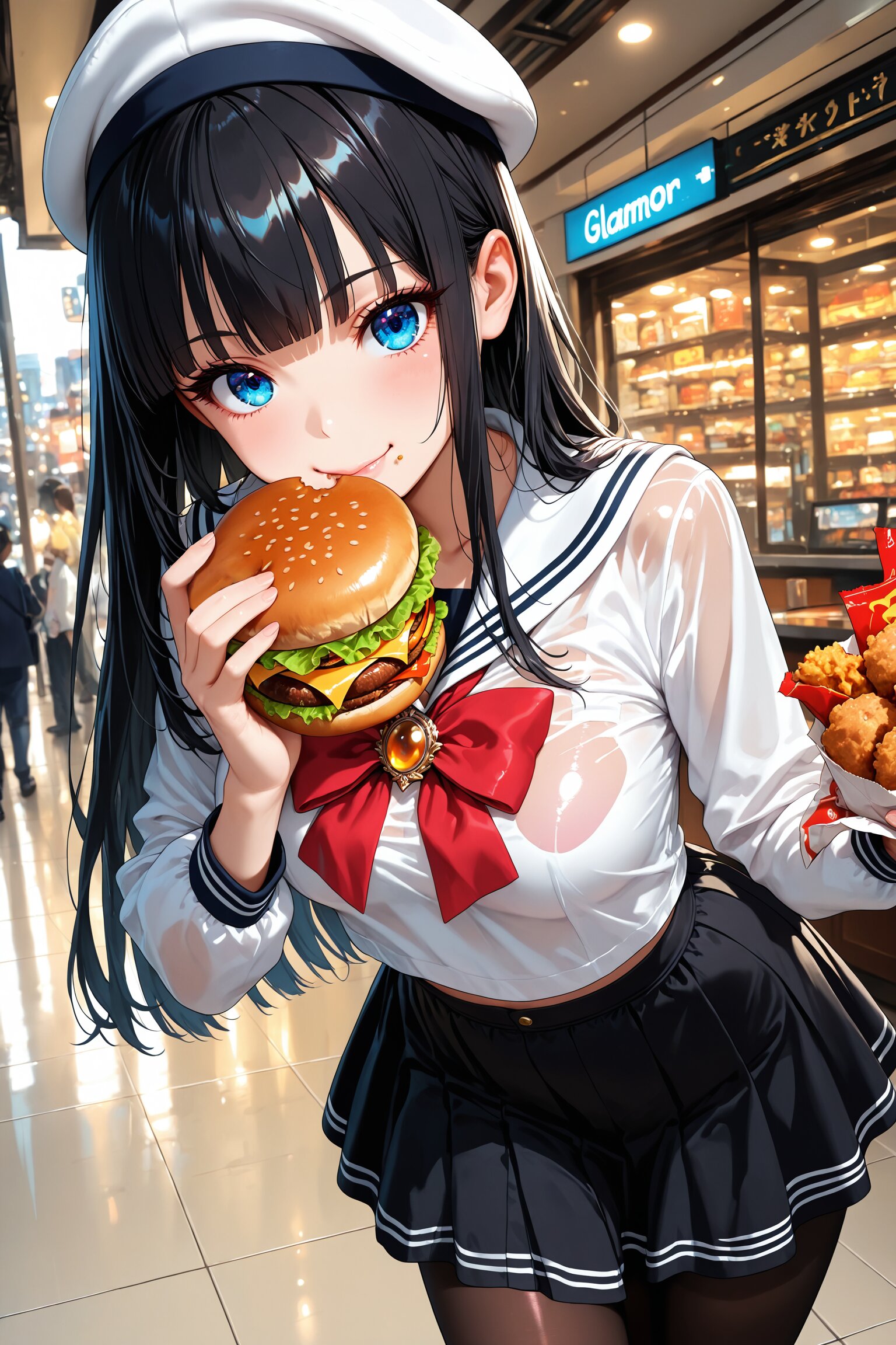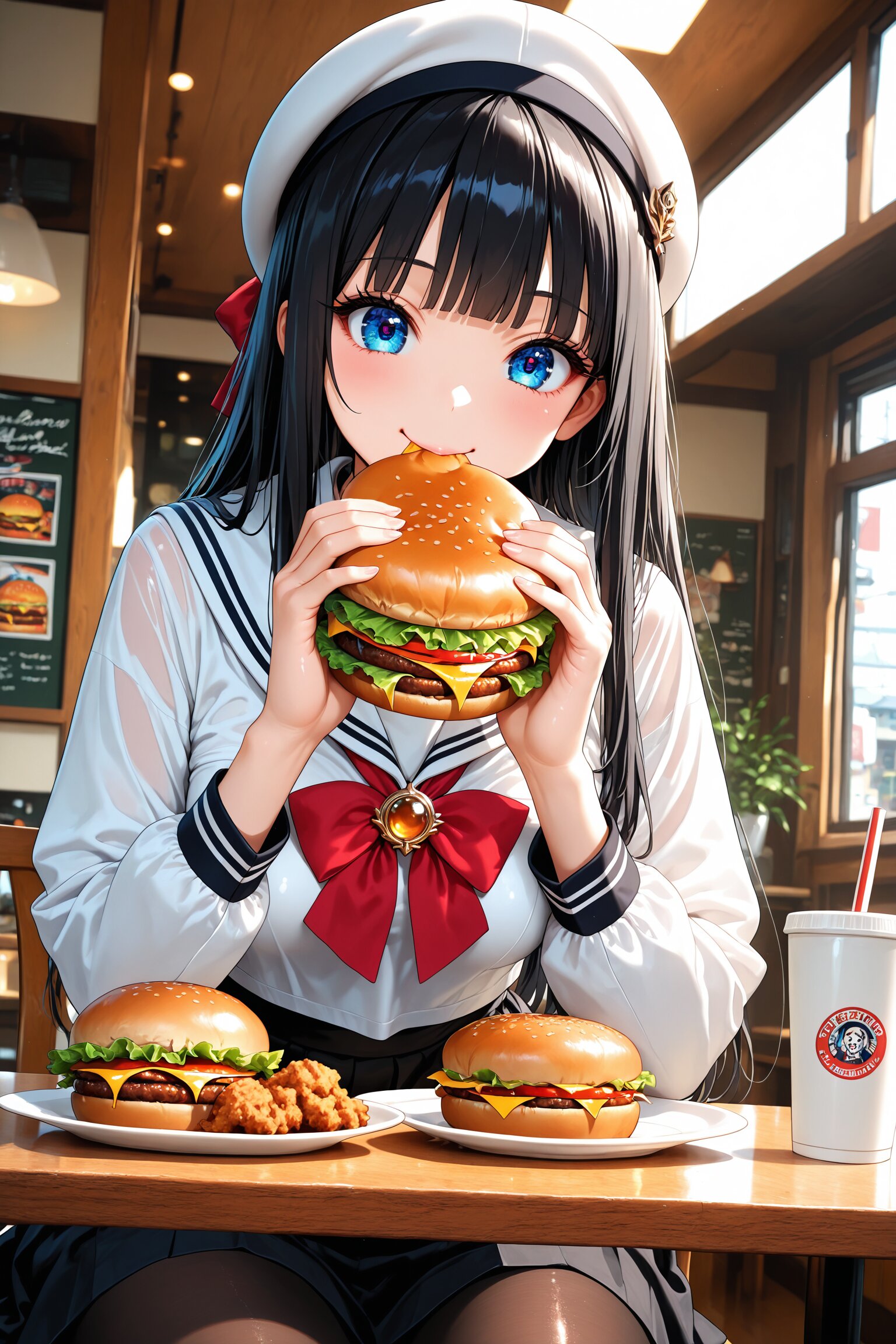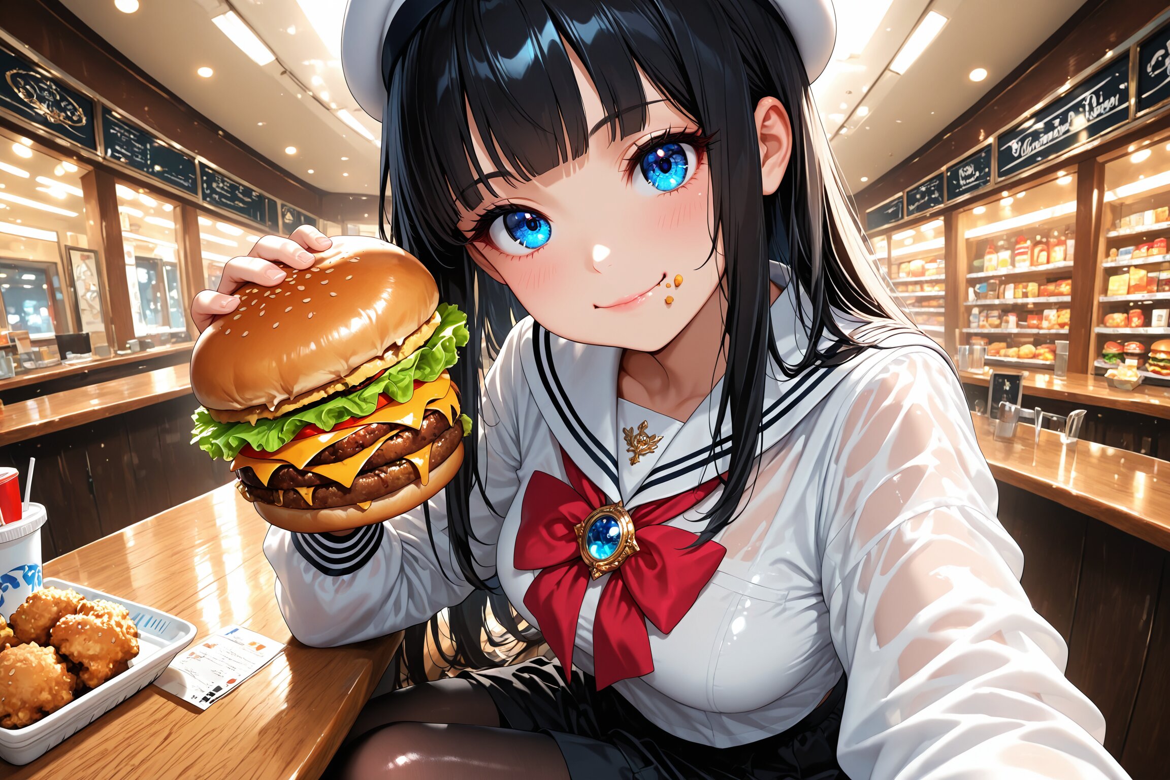 テーブルに肘をつき、大きなトリプルチーズバーガーを片手に持つ彼女は、じつに満足げな顔でにっこりと笑っていた。制服の胸元にはリボンの宝石飾りがきらめき、透けるような白いブラウスにハンバーガーのソースが一滴…ついている。