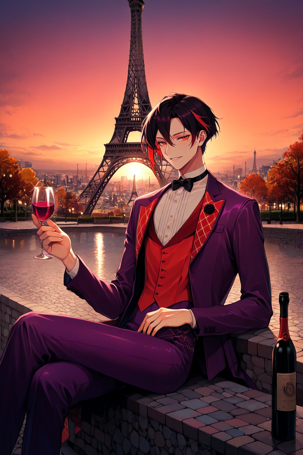 1boy, parisian_personification, elegant_man, slim_figure, deep_purple_suit, mature_sophisticated, white_shirt, black_bowtie, holding_wineglass, crimson_red_wine, confident_smile, half_closed_eyes, sharp_features, styled_black_hair, blue_highlights, fashionable, cafe_terrace, paris_background, golden_sunset, eiffel_tower, cobblestone_street, evening_atmosphere, warm_lighting, urban_elegance, relaxed_posture, crossed_legs, wine_bottle, french_ambiance, city_of_lights, charismatic_aura, self_assured, autumn_colors, highres, masterpiece, best quality