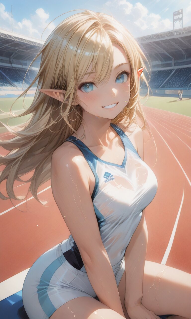 score_9, score_8_up, score_7_up, source_anime, masterpiece, amazing quality, very aesthetic, high resolution, ultra-detailed, absurdres, newest, scenery, 2d, semi-realistic, sharp focus, nice hands, perfect hands, perfect anatomy, perfect structure, (On a morning, the girl is sitting on Athletics Track in girls high school, gaze at me with an happy, grin face), knee up, spread leg, outdoors, 1girl, solo, cowboy shot, high angle, from side, ((close-up eyes, face focus)), (A sense of speed. A sense of dynamism). (She is wearing an skinny, Track and field uniform, running shorts). ultra detailed lips, ultra detailed face and hair, kawaii, adorable, cute, elf girl, (apatite eyes with CGI effect), (deep blonde hair:1.2), medium breasts, wide hip, sweat, wet clothes, BREAK, photorealistic, masterpiece, best quality, amazing quality, very aesthetic, high resolution, ultra-detailed, absurdres, newest, scenery, volumetric lighting,