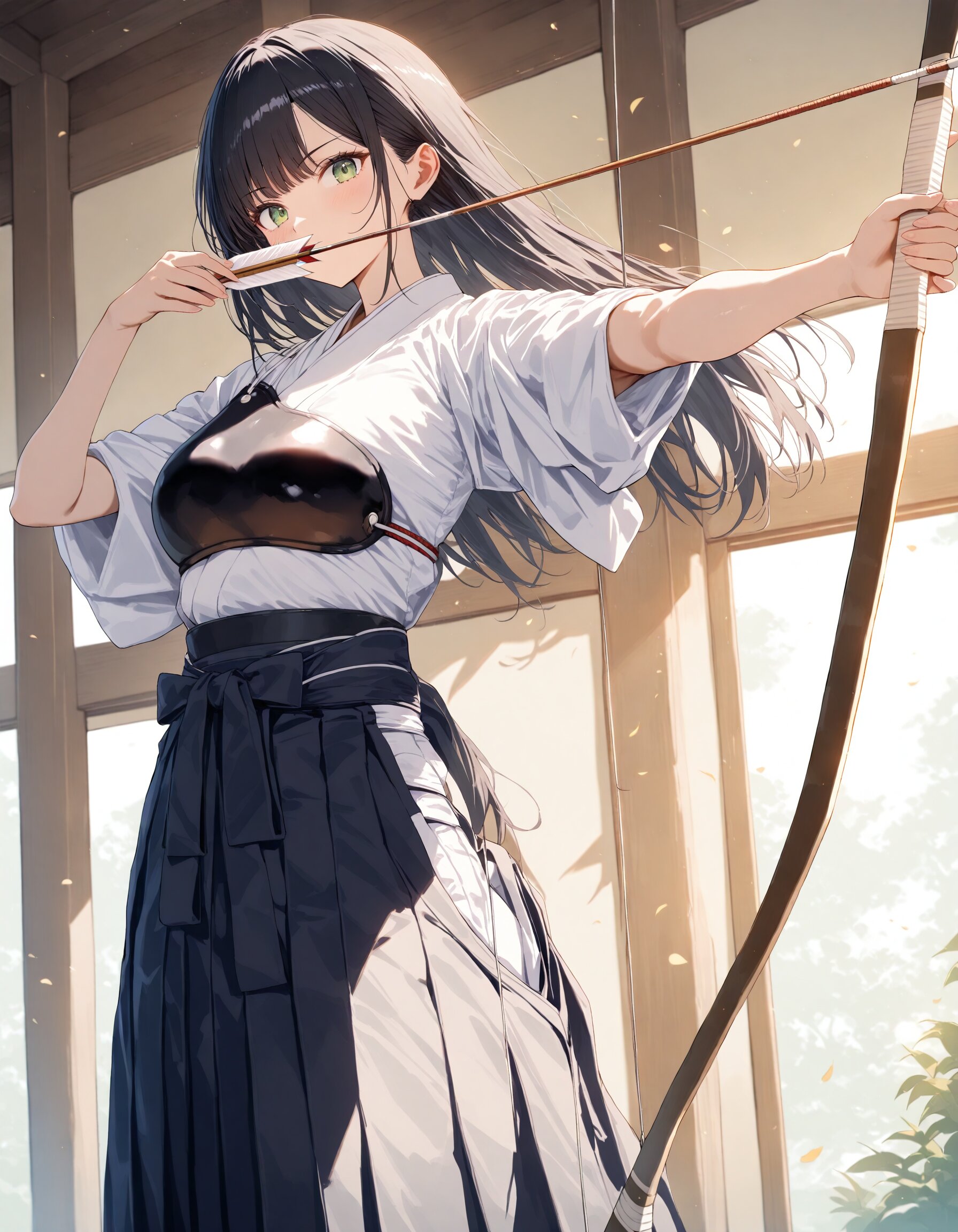 1girl, solo, black hair, long hair, straight hair, green eyes, medium breasts, smooth skin, kimono, white kimono, hakama, hakama skirt, muneate, kyuudou, archery dojo, standing, holding, yumi \(bow\), bow \(weapon\), holding bow \(weapon\), arrow (projectile), side view, masterpiece, high score, great score, absurdres