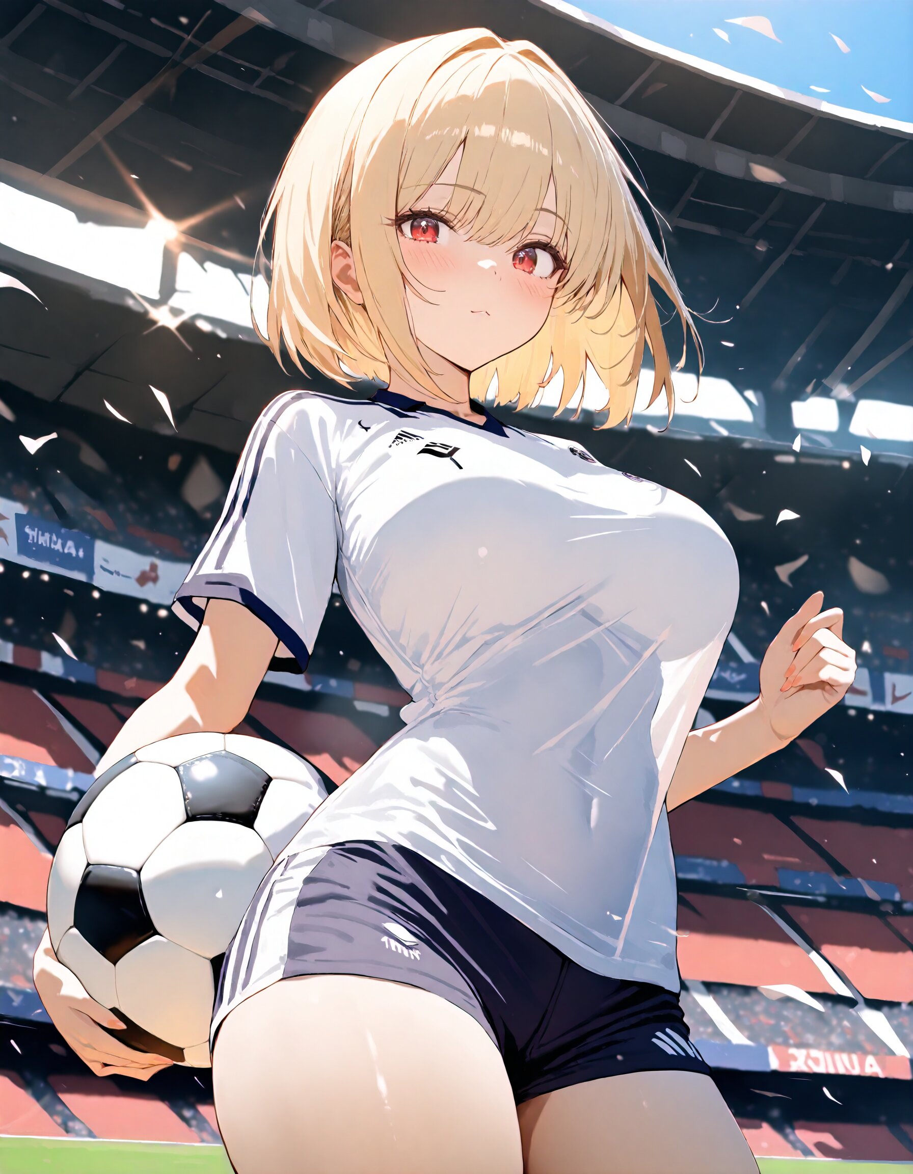 1girl, short hair, blonde hair, straight hair, red eyes, large breasts, smooth skin, soccer uniform, soccer ball, stadium, masterpiece, high score, great score, absurdres