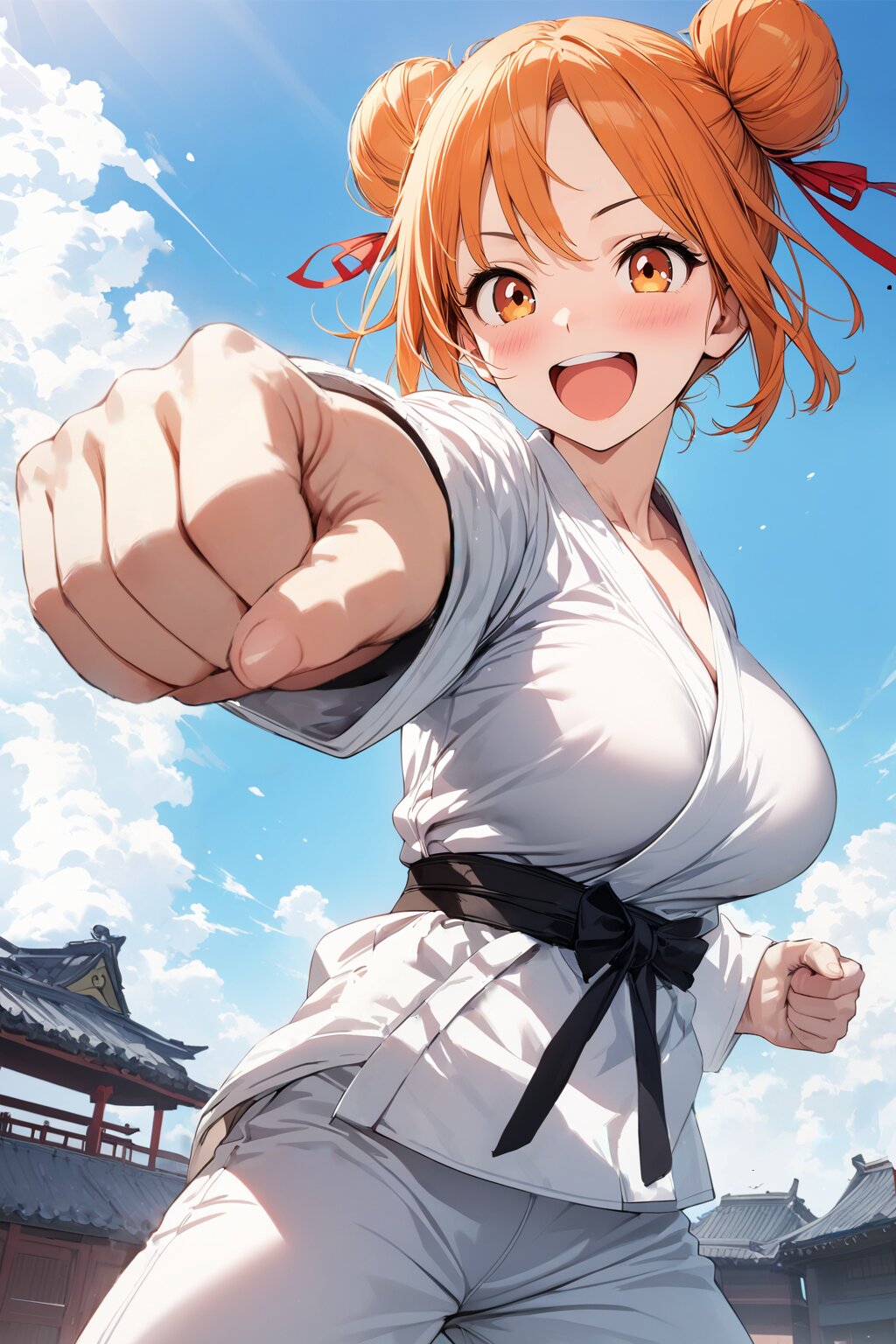 1girl, outdoor,blue sky, large breasts, orange hair,(double bun),(center parted bangs),sideburns,hair side red string ribbon, small orange eyes, nose blush,open mouth,(smile), karate wear,black belt,karate pants, punching,standing,reaching out, cowboy shot,dynamic angle,looking at viewer,from side:0.8, ((best quality)),((very high resolution)),full color,((ultra detailed)),extremely detailed CG,super fine illustration, manga style,hyperrealistic, perfect anatomy,super detailed skin,(beautiful detailed clear eyes),