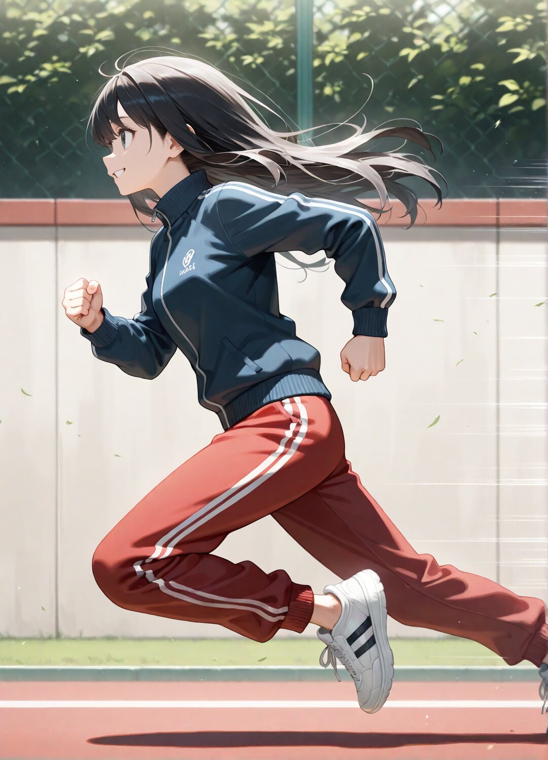 masterpiece,best quality,highres,highly detailed,detailed eyes,general,1girl,solo,smile,track suit,long track pants,sneakers,running,from side,black hair,clenched hands,speed lines,