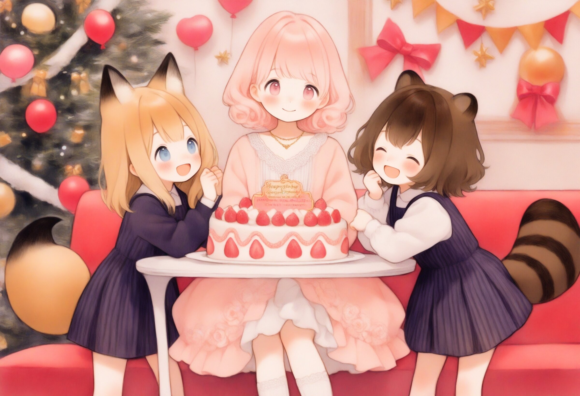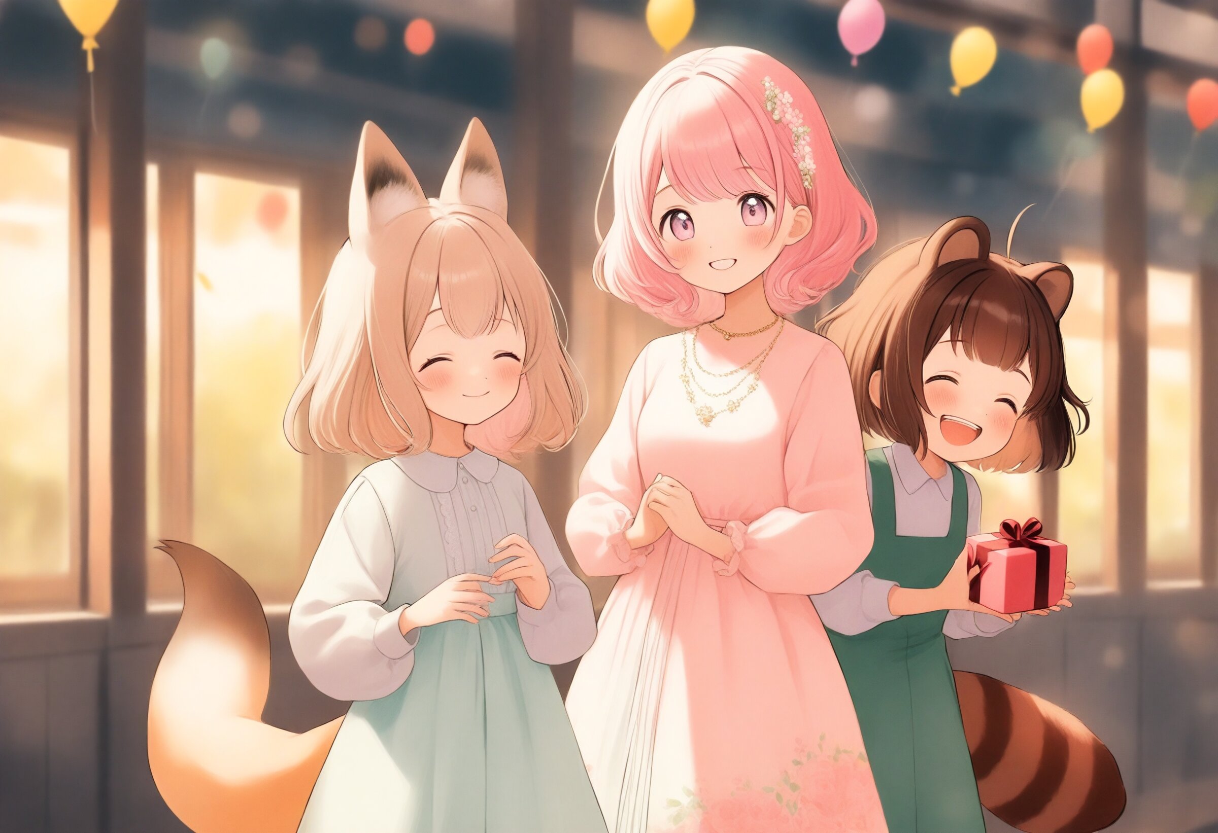 3girls, mid, general, traditional media, picturebook-style, (colored pencil drawing), pastel colors, soft tone, (blurred boundaries, drawing lines, Paper texture), cute, ultra-detailed background, (masterpiece, best quality, high score, great score), dynamic pose, dynamic angle, looking away, height difference, from below , indoors, food, balloon, cake, couch, table, fruit, birthday party, cup, drink, <lora:add-detail-xl:1> <lora:sdxl-hairdetailer_01:1> BREAK 3girls, loli, small girl, light brown hair, medium hair, bangs, blue eyes, (light brown fox ears, Light brown fox tail with white tip, petite), smile, happy, pink pinafore dress, holding gift box, from side, BREAK 3girls, tall girl, light pink hair,light pink eyes,loose wavy hairstyle,short bob cut,floral hair accessory,happy smile, white frilly chiffon blouse, mint green high-waisted skirt, or pastel pink floral dress, white lace socks, light pink strap shoes, delicate gold necklace, spring fashion, soft pastel colors, cute and elegant outfit, BREAK 3girls, loli, small girl, dark brown hair, short hair, messy hair, bangs, green eyes, tareme, (dark brown raccoon ears, dark brown raccoon tail with striped pattern), laughing, happy, green pinafore dress, holding gift box, from side,