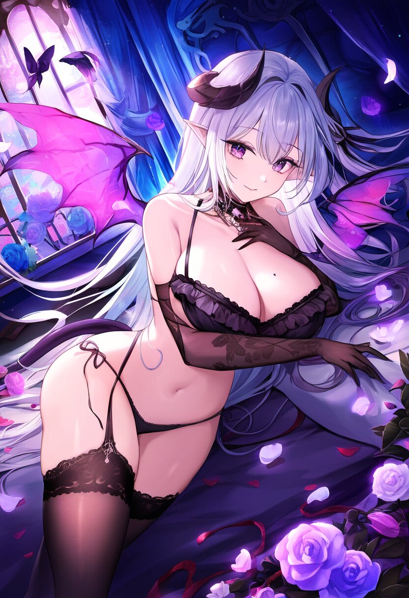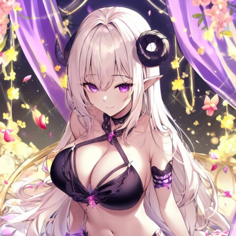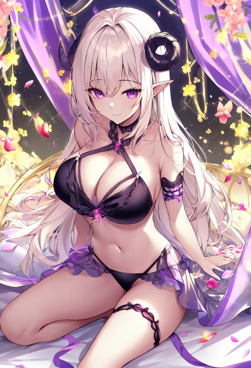 very aesthetic, best quality, absurdres, The succubus lies on a canopy bed surrounded by glowing flowers. Her bikini with ruffled trim and her wings create a striking contrast against the colorful garden. A strong wind swirls petals around her as she gazes shyly with her enchanting purple eyes, her navel and mole adding subtle details.