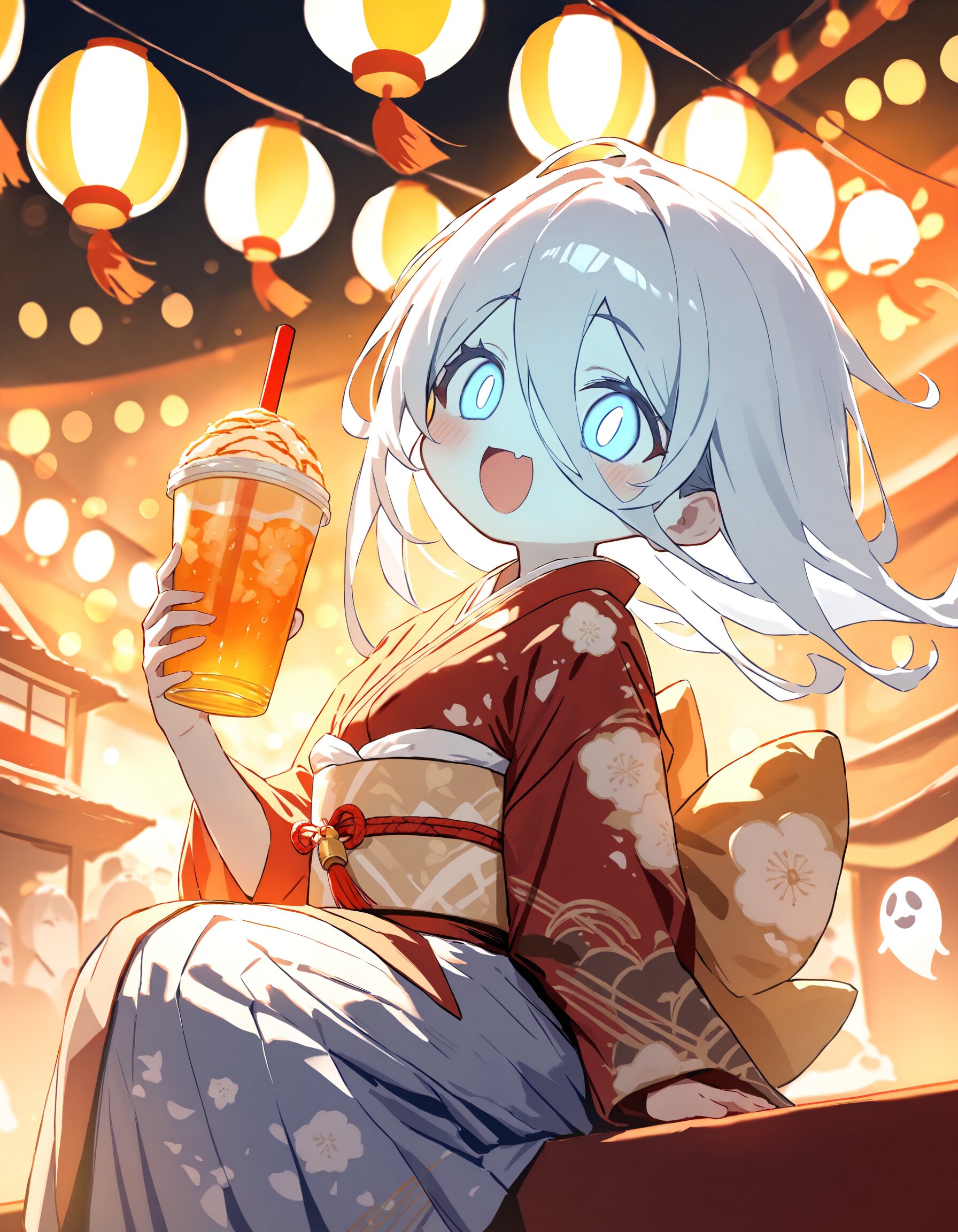 ghost girl, happy, chibi, holding food, holding drink, warm lighting, highly detailed, japanese festival, masterpiece, high score, great score, absurdres