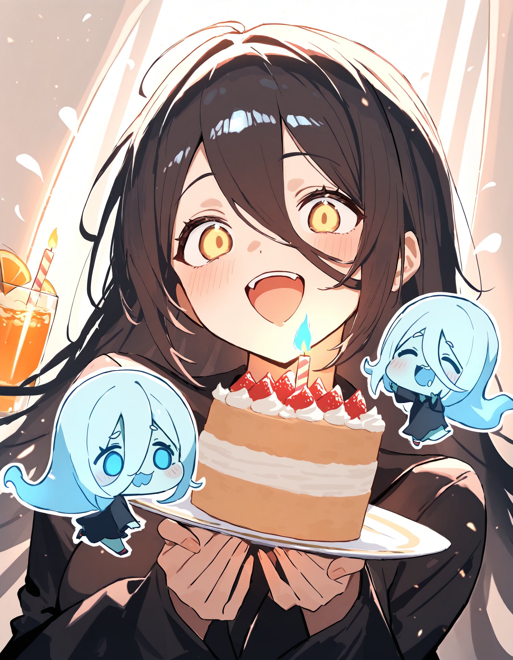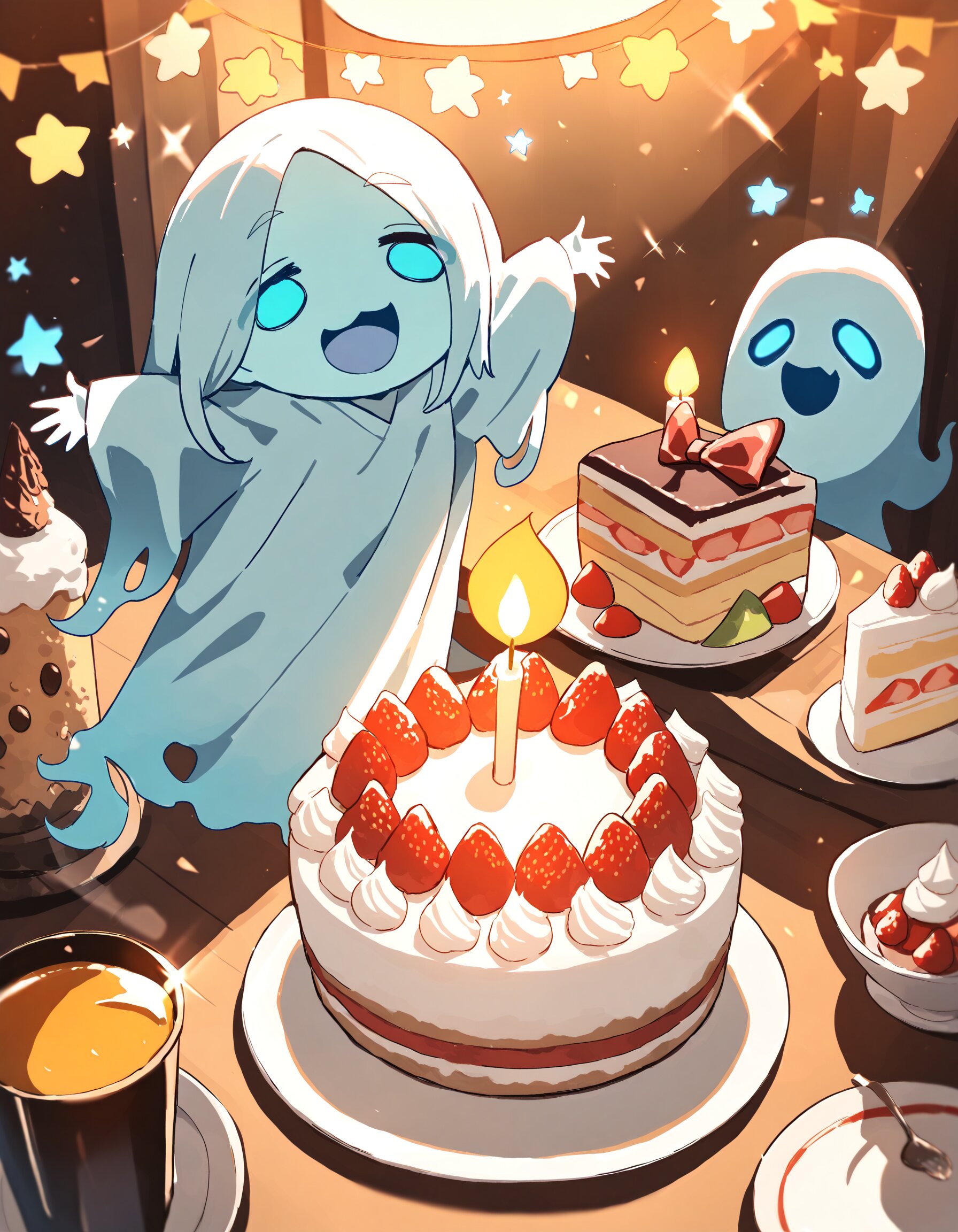 ghost girl, happy, cake, candle, drink, chibi, masterpiece, high score, great score, absurdres