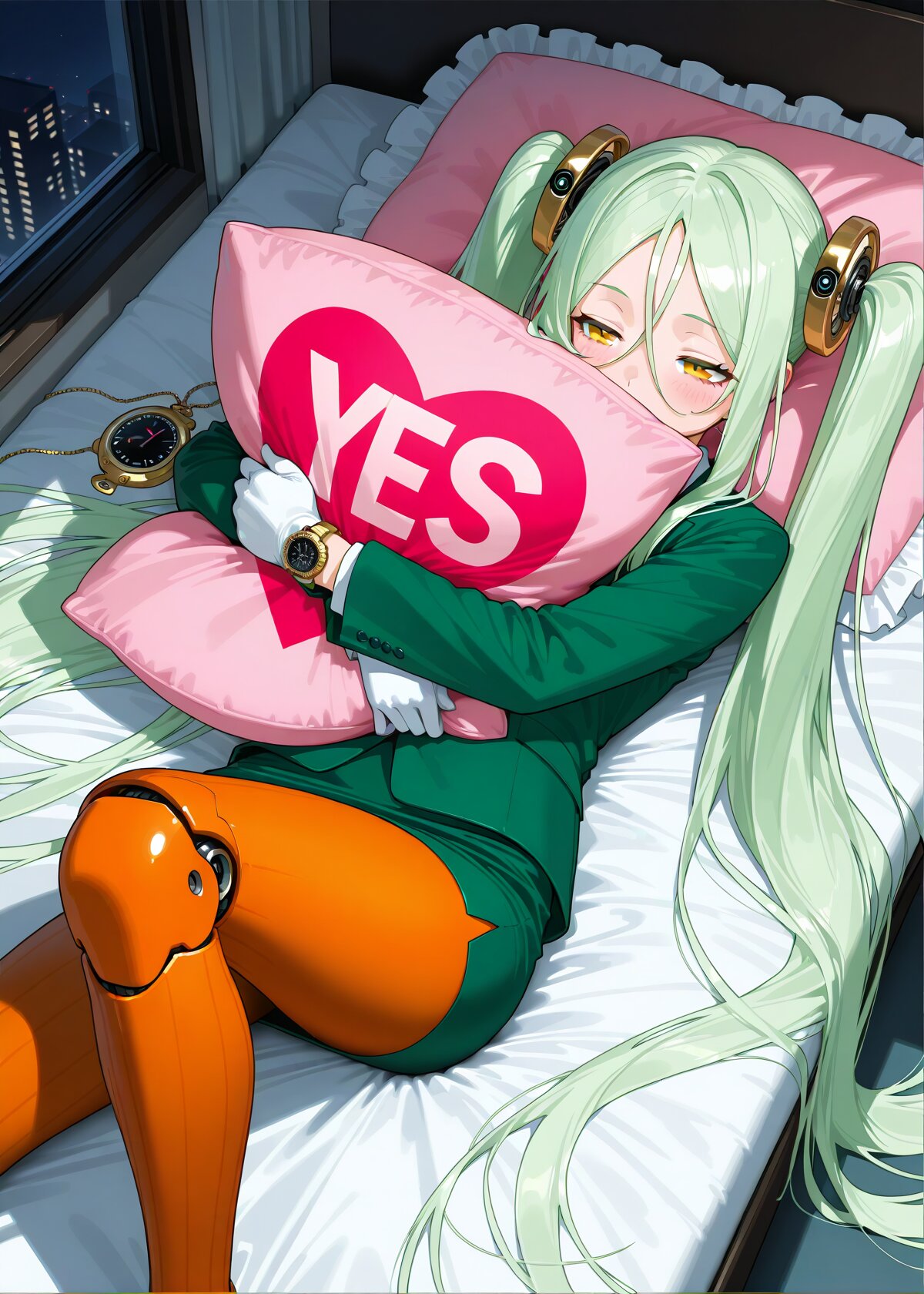 1Robots lady, solo, Prosthetic, Machine joints, Mechanical accessories, mechanical hair ornaments, orange eyes, light Green hair, very long hair, rabbit style twintails, parted bangs, long bangs, long side hair, hair between eyes, perfect center part, holding electric massagers on shoulders, department store lady, Green office lady outfit, white gloves, orange legwear, green legwear, striped legwear, mini tight skirt, big Watch hair ornament,, watches, watch necklace, department store, solo, cushion, 1girl, , , bed sheet, frilled pillow, futon, on bed, , , under covers, , head on yes-no pillow, holding pillow, , lying, , object hug, on back, pillow hug, yes-no pillow, blush, , half open eyes, night,