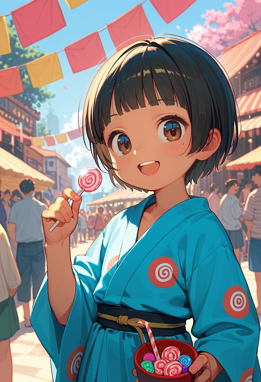(score_9, score_8_up, score_7_up),rich contrast,outdoor,(festival, matsuri), solo focus,(large cotton-candy:1.35), upper body, BREAK 1girl,solo,cute,(female child,11 yo),black hair,(bowl cut),blunt bangs,flat chest,brown eyes, tan, smile,happy, large open mouth, kimono,yukata,
