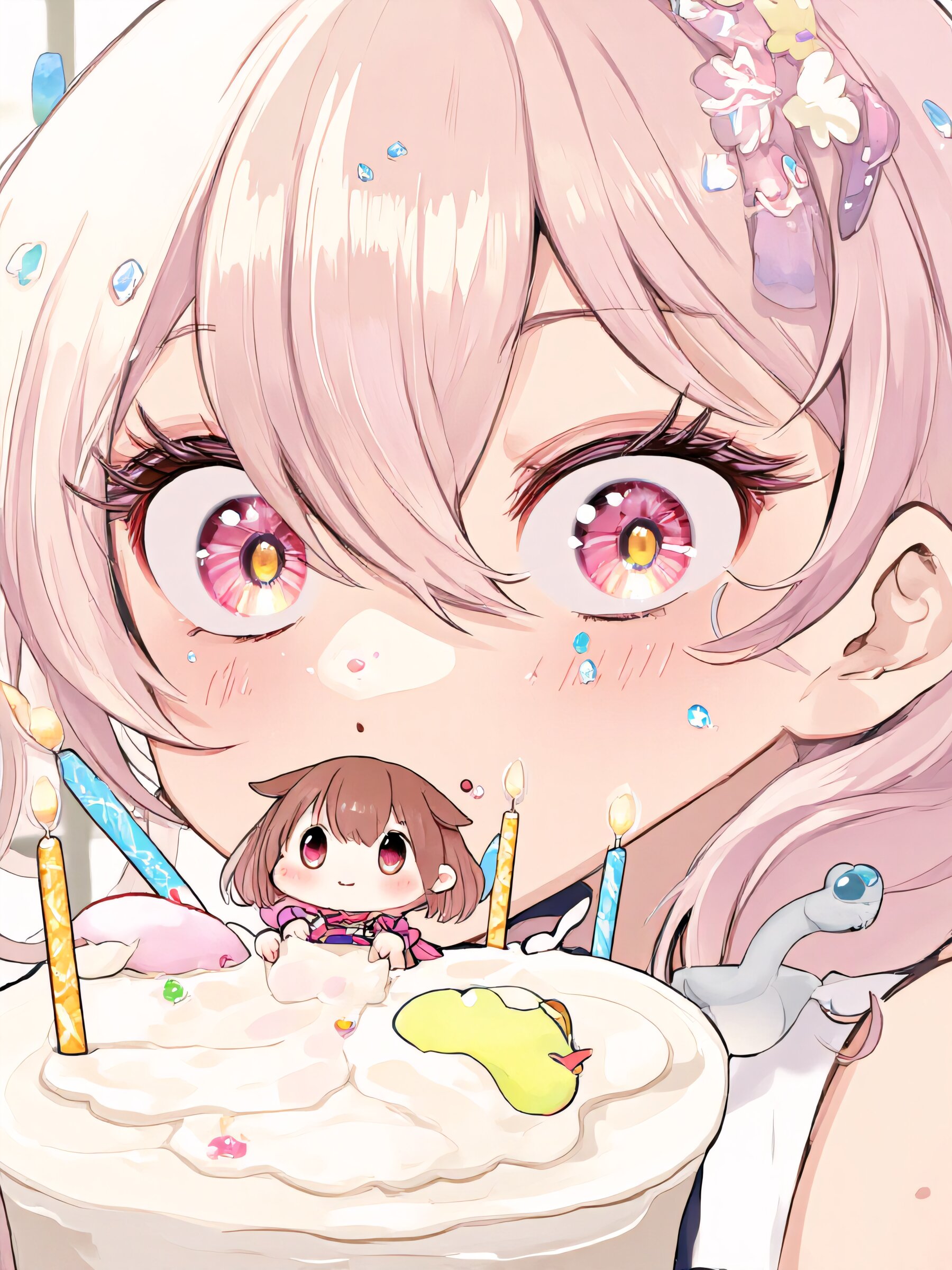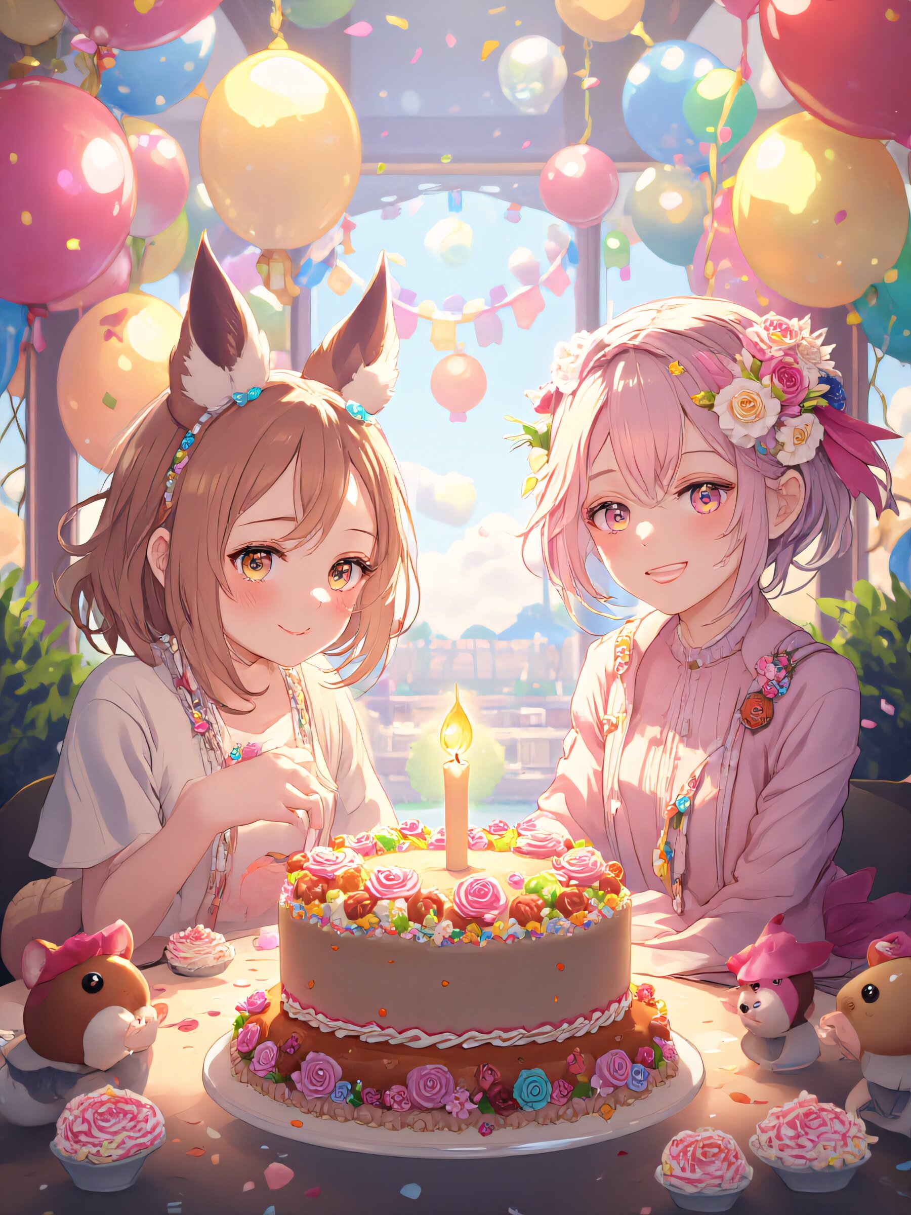 2girls,Birthday cake HINAKO is 1girl, light pink hair,light pink eyes,loose wavy hairstyle,short bob cut,floral hair accessory,happy smile, white snake, \n RIRIA is 1girl,light brown hair, long hair, amber eyes, wild boar's ears, little wild boar \n