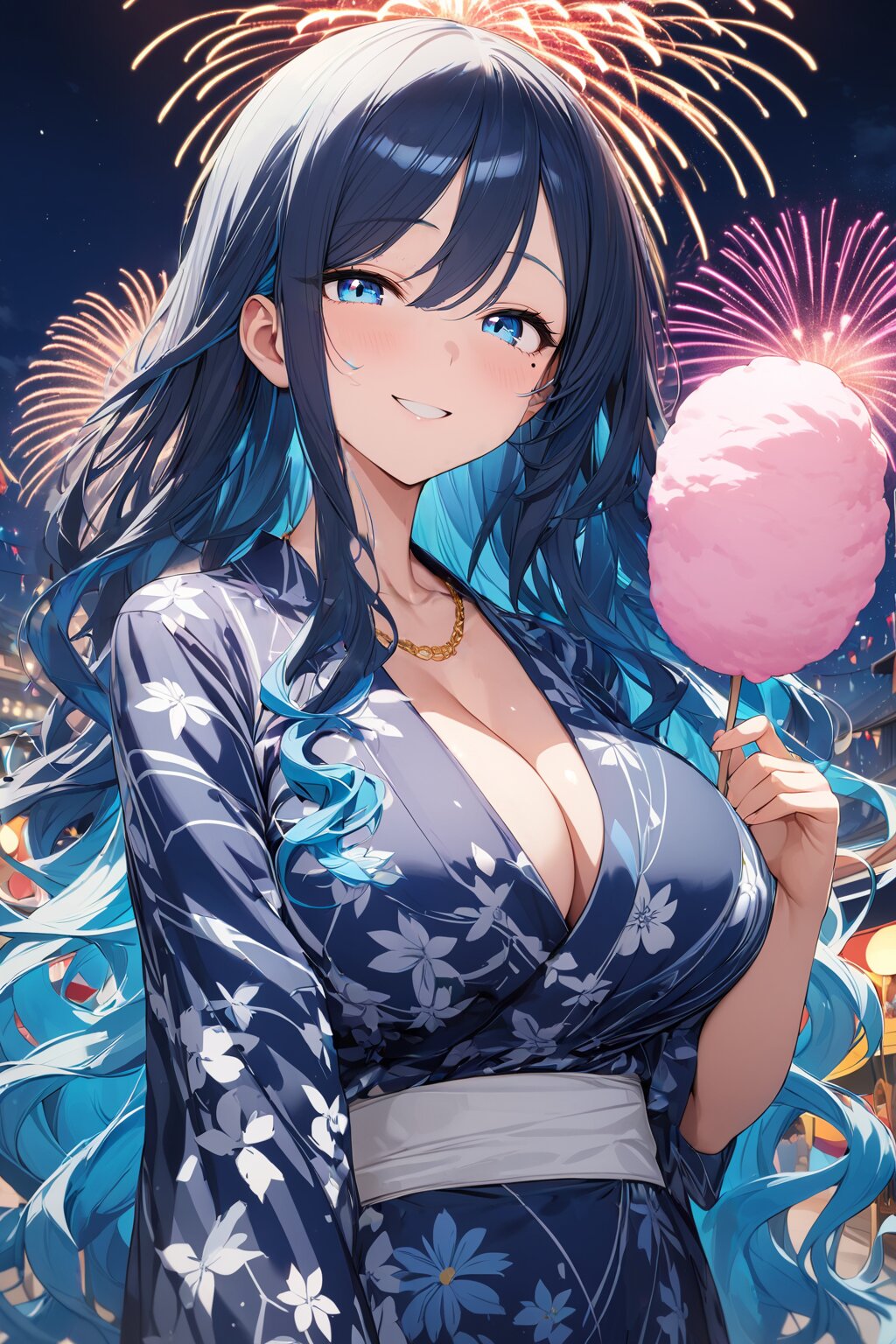 1 girl, night:1.3,festival,night fair,fireworks, huge breast,slender face,slender,(shiny skin),tall, (navy and cerulean multicoloerd hair:1.3),(absurdly long straight hair:1.3),swept bangs,(sidelocks),(wavy hair:1.3), ((hair on chest:1.3)), (glowing blue eyes:1.3),(narrow eyes:1.3),(tareme:1.3),(sleepy eyes),half close eyes,(mole under eye:1.3), seductive smile,chuckle,smile, navy Patterned yukata,gold chain necklace, holding cotton candy,reach out,open hand,arched back, cowboy shot,dynamic angle,from side:0.8,looking up sky, ((best quality)),((very high resolution)),full color,((ultra detailed)),extremely detailed CG,super fine illustration, manga style,hyperrealistic, perfect anatomy,super detailed skin,(beautiful detailed clear eyes),