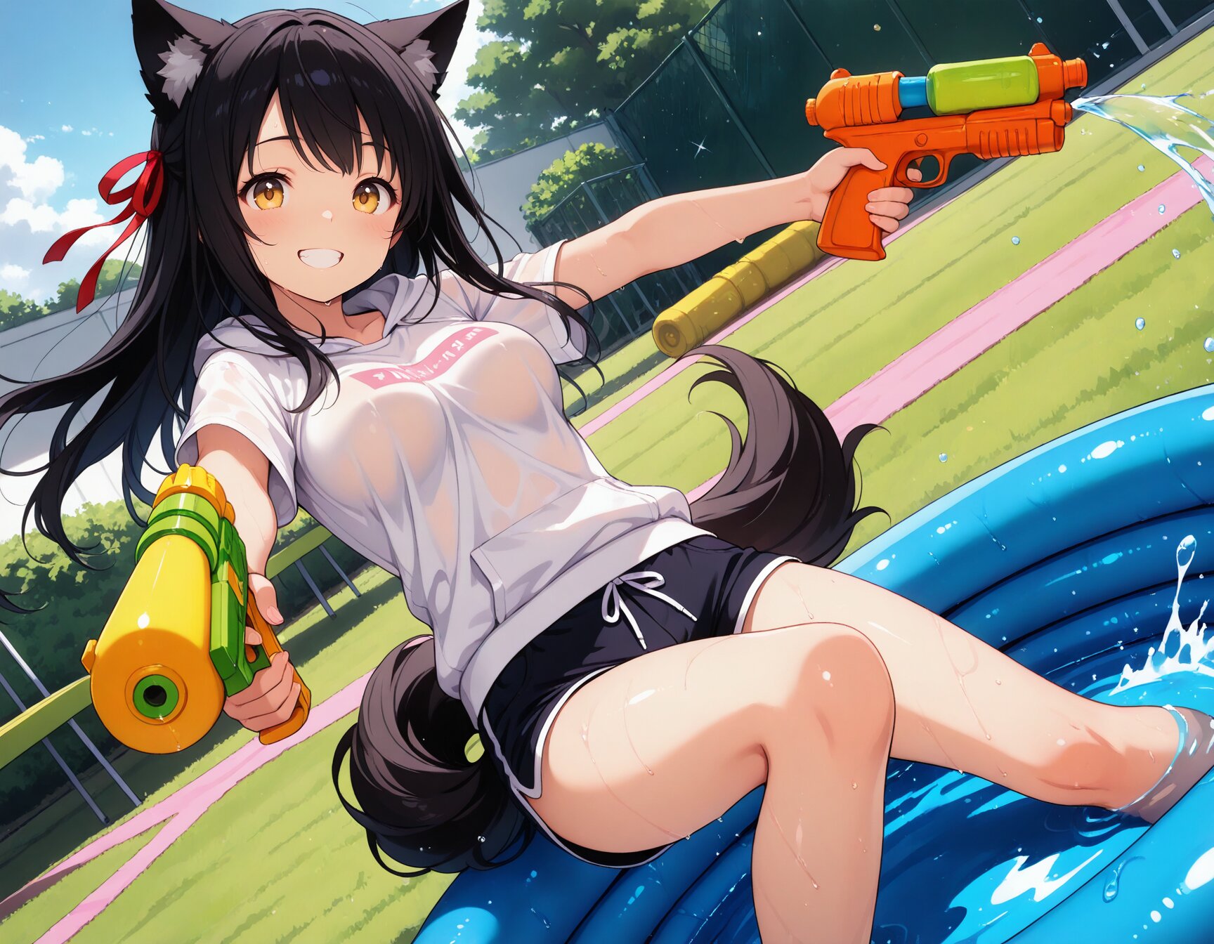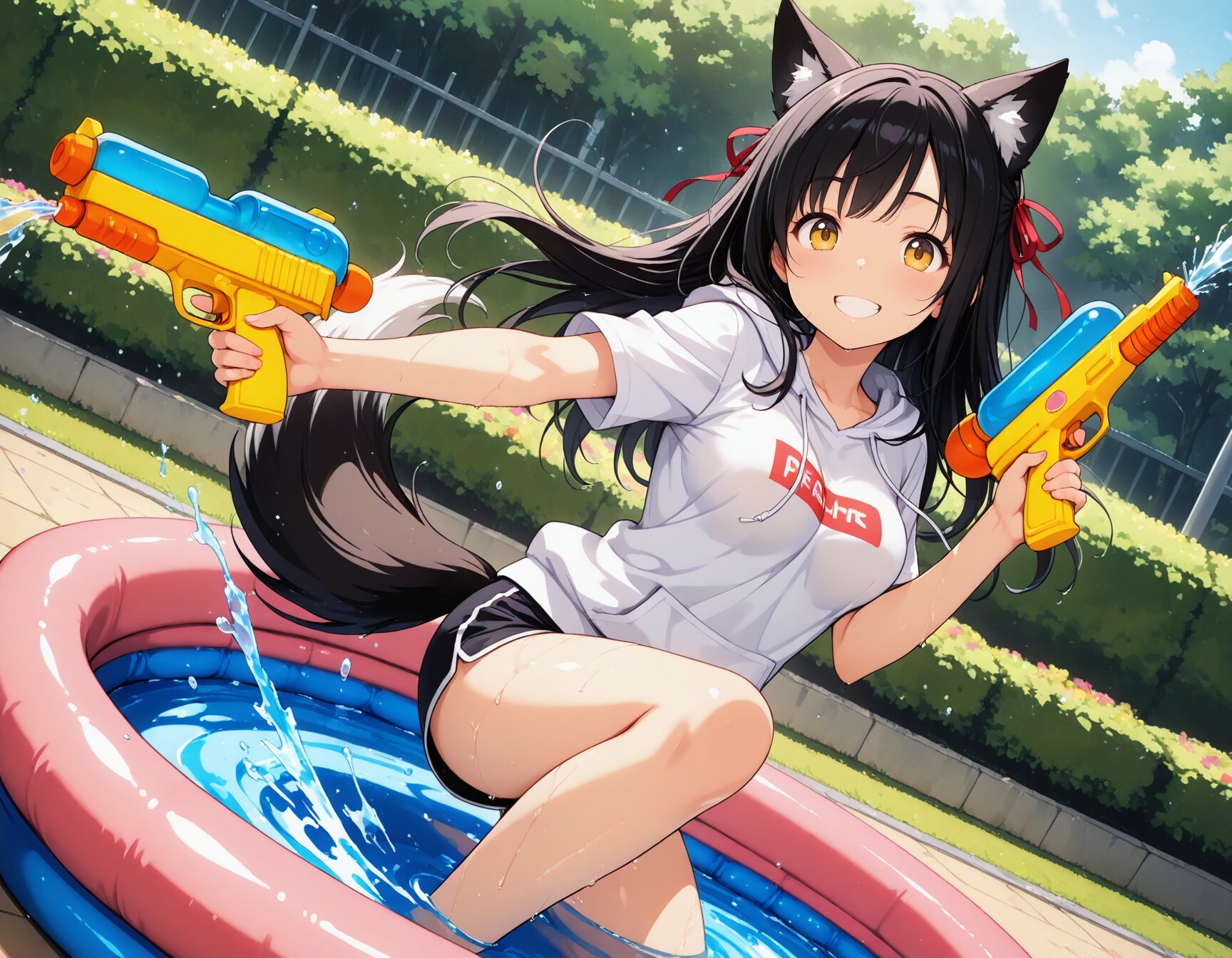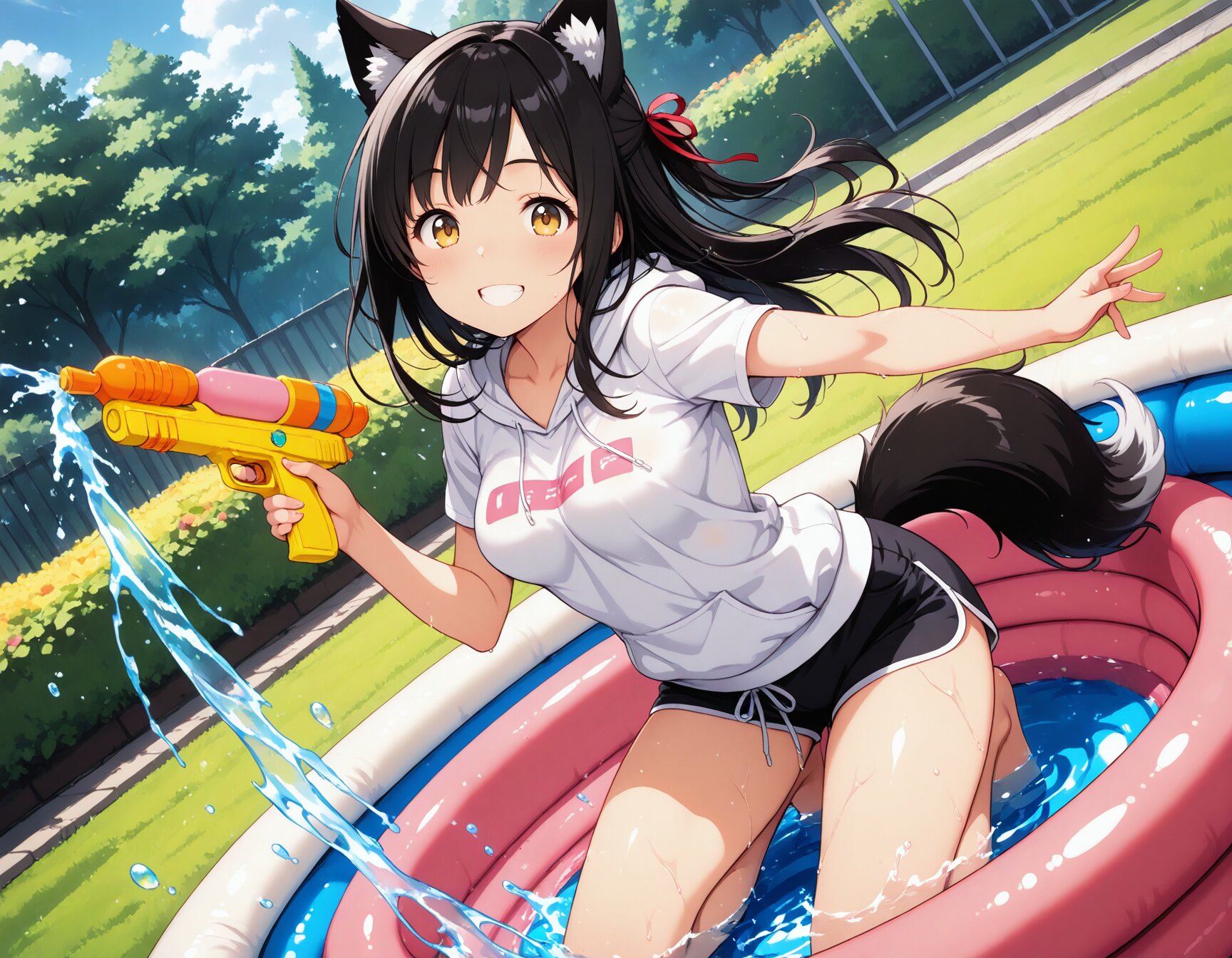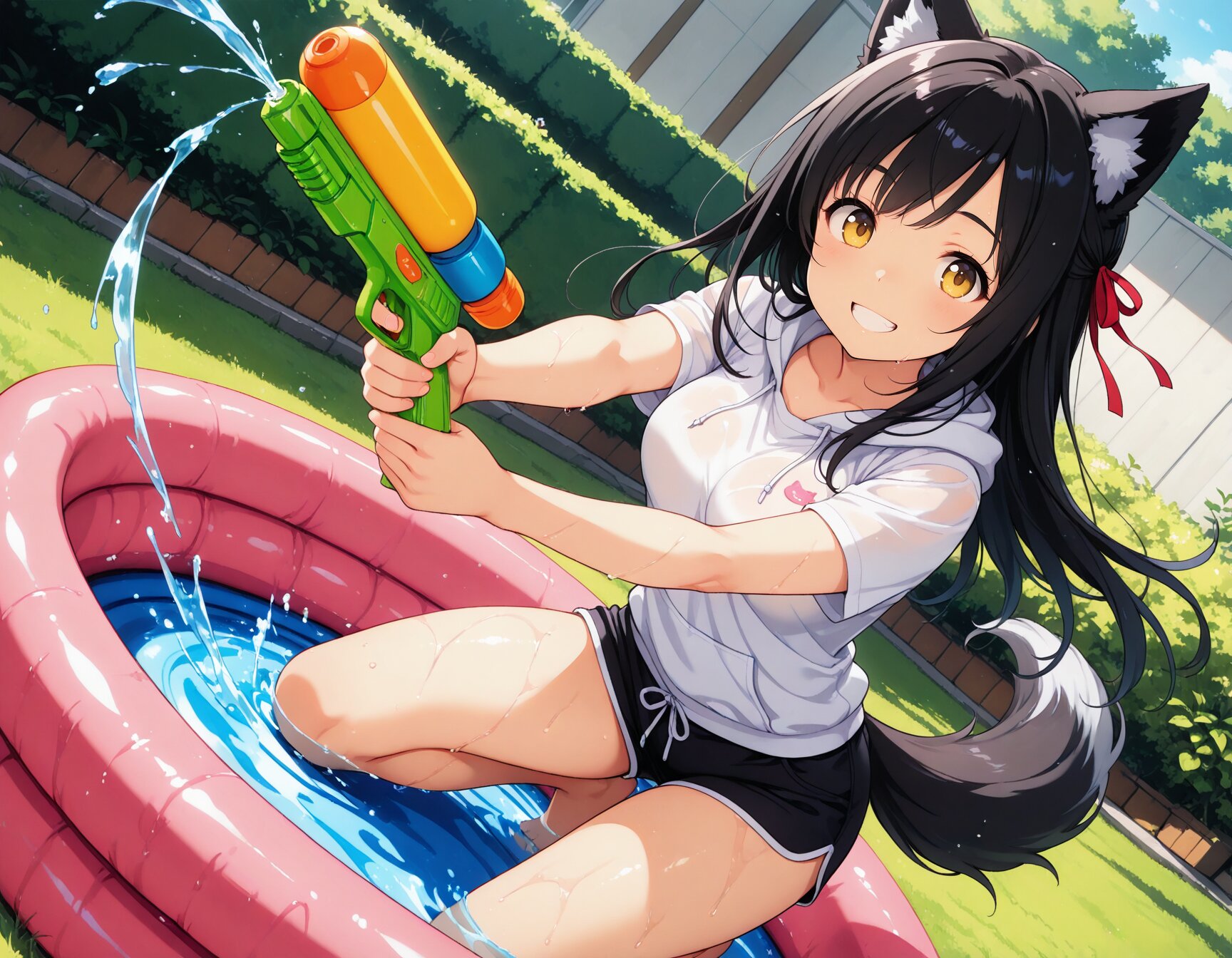 1girl,solo,<澪>, floating hair,:d,grin,looking at viewer, hoodie,T-shirt,short pants,garden,wading pool holding water gun,splashing,wet lense,dutch angle,cinematic scene,kneeing,incoming attack, general,safe,, appropriate posture,appropriate configuration,ideal ratio body proportions,perfect anatomy, <lora:Fixhands_anime_bdsqlsz_V1:1>, masterpiece, best quality, amazing quality, very aesthetic, absurdres, highres, newest