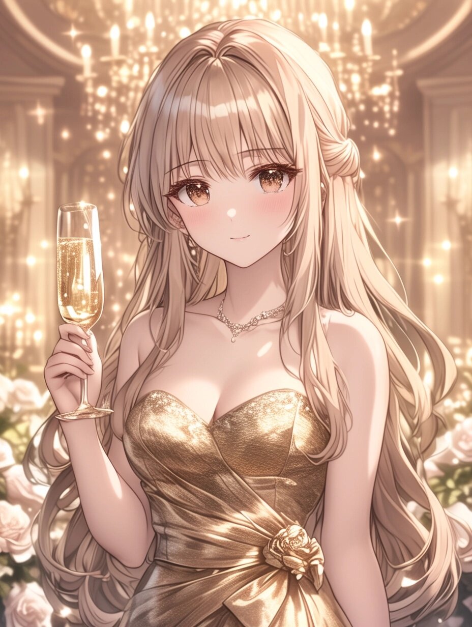anime style, light brown long hair, brown eyes, beautiful, gold one-shoulder dress, Champagne glass in the hand, blurred chandeliers and white roses in the background