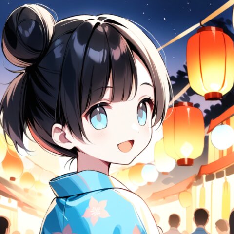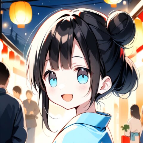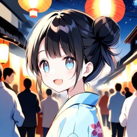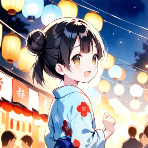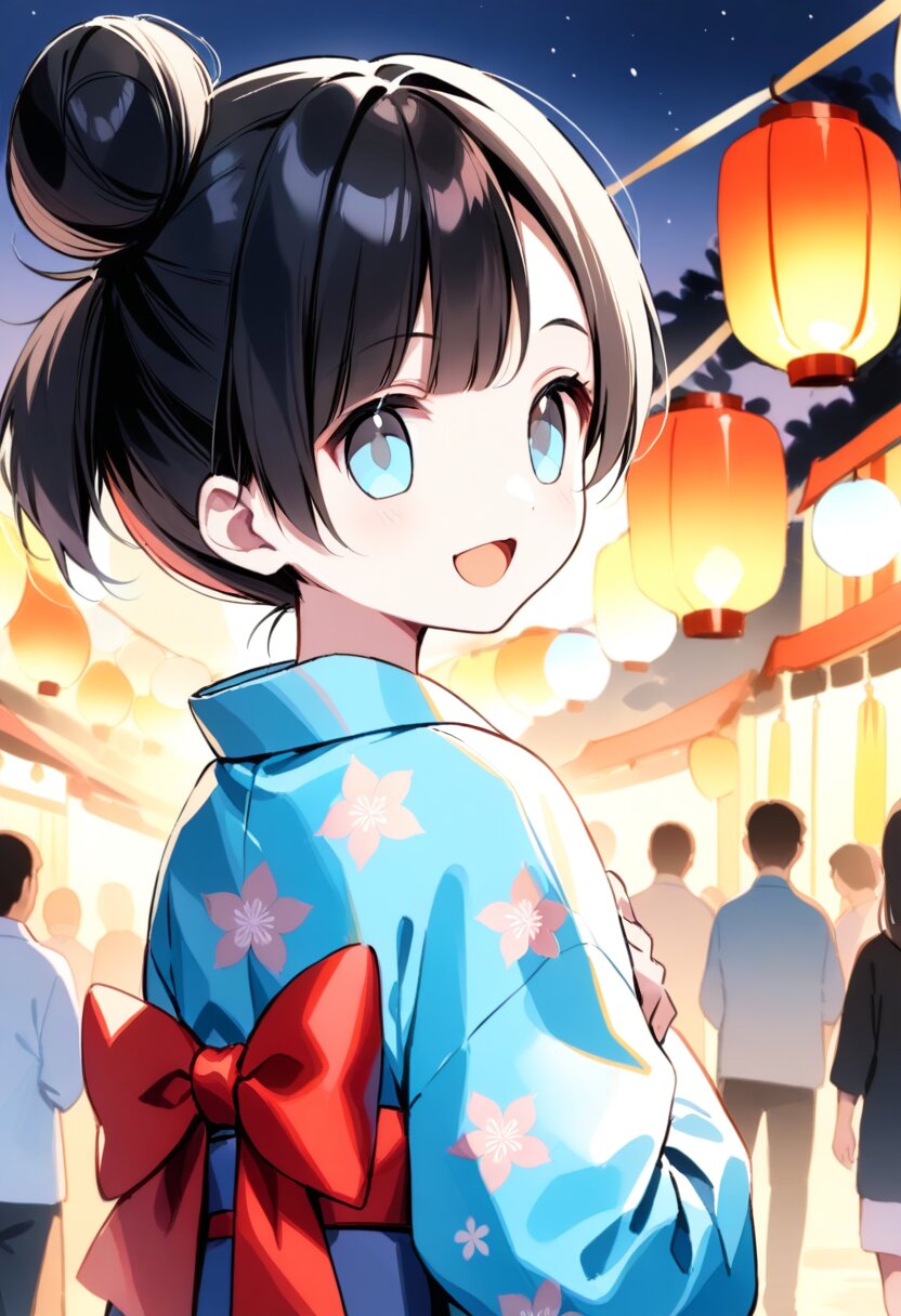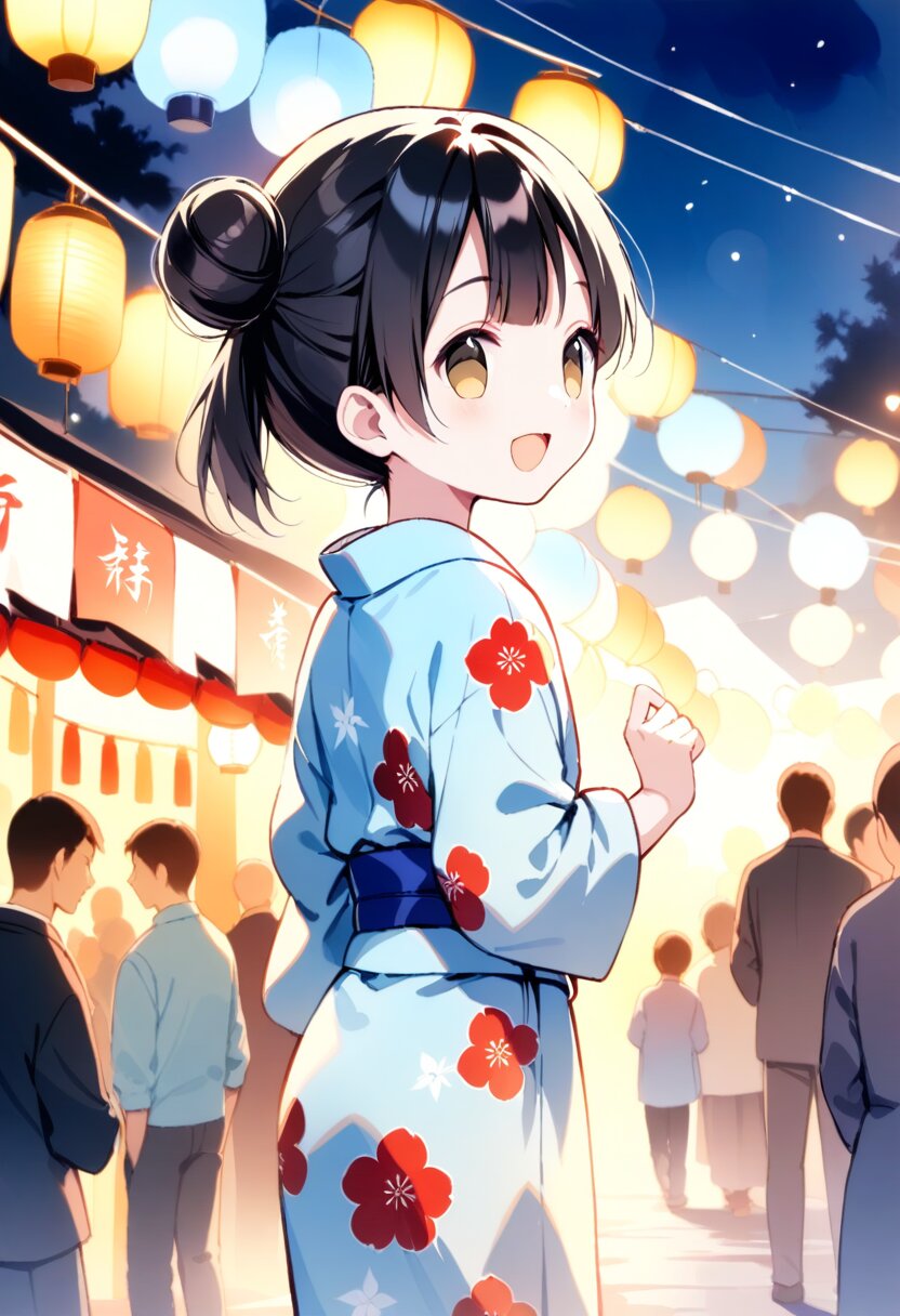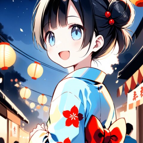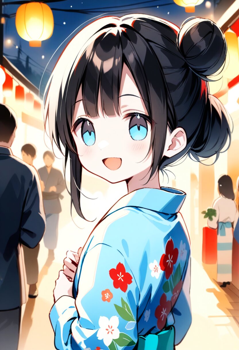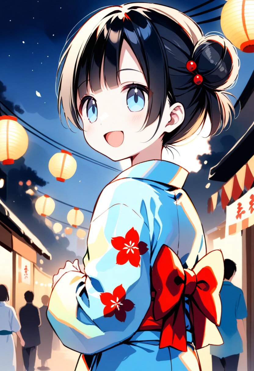 <lora:inmnstylexl:1> <lora:yumekawaii_ftr:1>best quality, masterpiece, very aesthetic, general, watercolor painting, 1girl, 10 years old, black hair, single bun, smile, open mouth, light blue yukata, lookback, night, Japanese festival