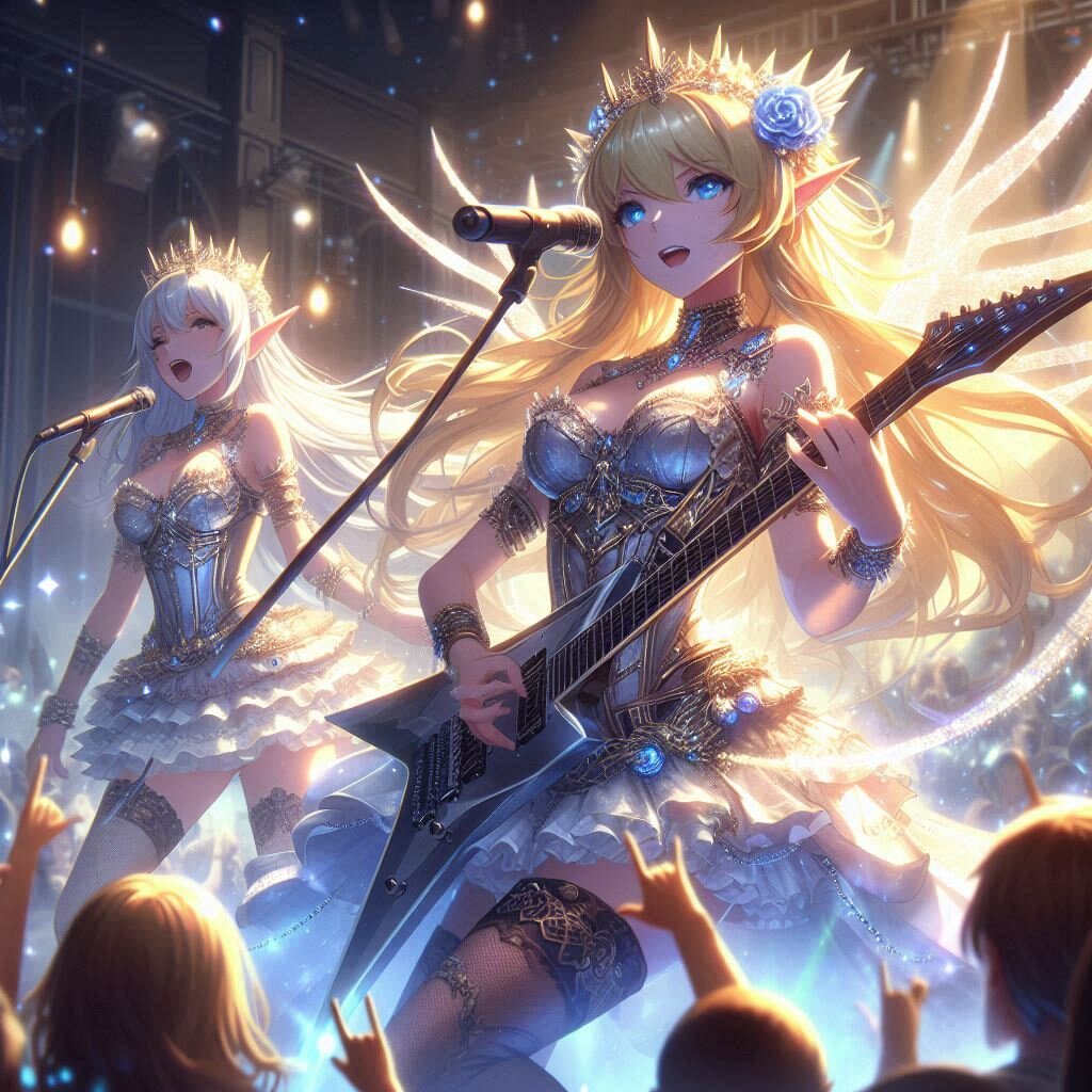 映画のポスターの様なイラスト。映画のラストシーンの様なダイナミックな構図と情景。オフィシャルアート。 日本のアニメの画風のセミリアルなクールヒロイン。光と光の粒子で出来たヘヴィメタルスタイルの衣装を着たグラマラスで金髪碧眼のエルフ少女。ステージの上で彼女はエレキギターを弾きながら熱く激しく熱唱している。会場を埋め尽くすマッチョの観客の熱気はMAXだ。