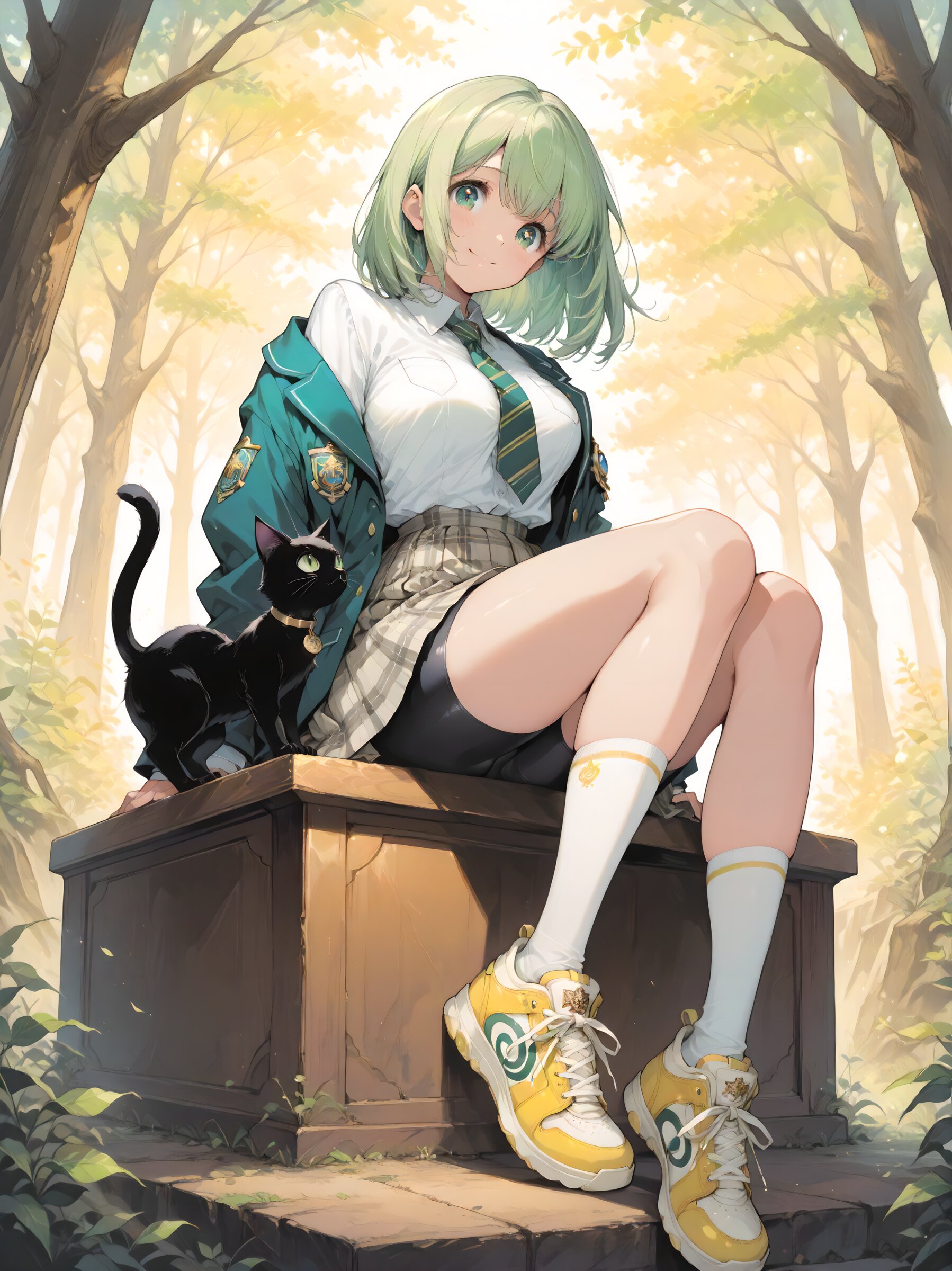 Best quality, Masterpieces, simple background, lots of negative space, delicate anime-style illustration, fine detail, solo, young girl, small body, kawaii, round face, green hair, green eyes, Big eyes, midium breasts, medium hair, shaggy bobbed hair, always calm, world wanderer, Fascinating, shy, ((chunky sneakers)), bike shorts under skirt, bottomless, smile, Forest green blazer with school emblem on the chest pocket, White dress shirt with a classic collar, Green and gold striped necktie, Plaid skirt, knee-length, White knee-high socks or tights, cinematic angle, dynamic pose, official wallpaper, content, gothic composition, towering bookshelves, hidden doorway slightly ajar, black cat sitting calmly in front