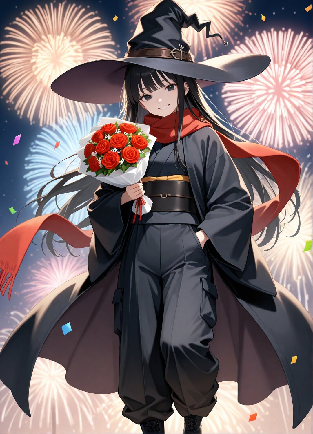 masterpiece,best quality,highres,highly detailed,detailed eyes,general,1girl,solo,17yo,(hand in pocket,holding a large bouquet,black witch hat,long red scarf,grin),cute girl,slender,small breasts,very long sleeves,light smile,black hair,long hair,bangs,black eyes,Witch girl,(long black Witch cloak,long black Witch kimono robe, black obi,long black cargo pants),boots,slender girl,so many large beautiful fireworks,Confetti,confetti,fantasy,