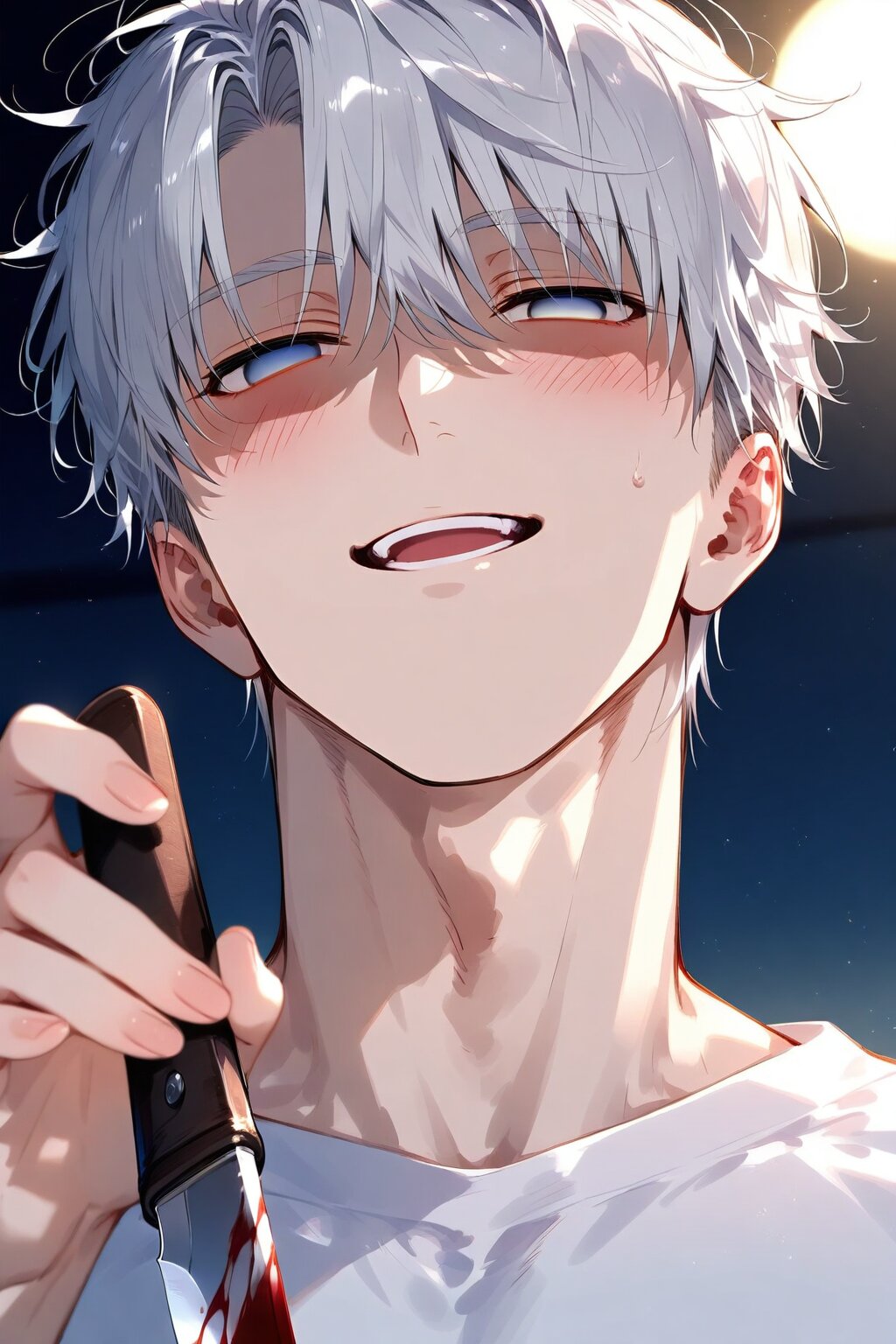 (male focus:1.5),absurdres, (best quality),(solo:1.5), BREAK,(1 boy),mature male,male face,male eyebrows,(yandere), BREAK,(shaded face, eyes in shadow:1.8), (giggling:1.5),(blush:1.8), crazy,under rim eyewear, BREAK,(white hair),wavy hair,(extra short hair:1.2), BREAK,(empty eyes, blank eyes:1.8), male eyes,evil eyes,(half-closed eyes:1.5), BREAK,looking at viewer,(pov),horror,dark,holding knife,