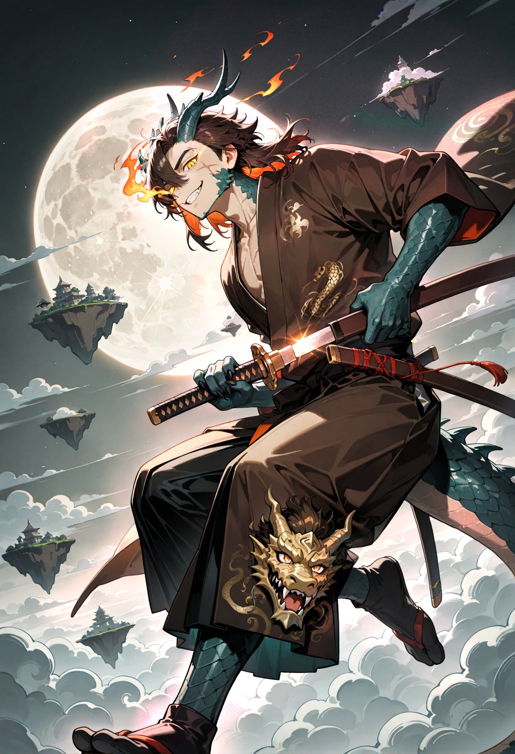 (face:1.0) from below, looking down , (dutch angle:1.2), (above the clouds:1.4), (in the sky:1.3) , (large full moon:1.2), round frame background,circle frame background, best illuminate,wonderland,(some floating island,floating city:1.4),(floating girl:1.3), weightlessness,zero gravity ,giant scales,, sumi-e, faux traditional media, color ink \(medium\), painting \(medium\), calligraphy brush (medium), monochrome, spot color, 1boy, monster boy, creature, (monster focus:1.0), serious dragon, dragon head, dragon face, horns, cobalt green body, scales, monsterification, tusks, dragon foot, dragon hands, dragon claws, samurai, (muscular male:0.8), medium hair, long bangs soft hair, flaming eye, eye trail, beautiful garnet eyes, scar on cheek, scar on leg, , (holding Japanese hazel brown sword:1.3), scabbard, (delicate pattern kimono:1.0), , egasumi,, tabi, (evil smile:1.2), seductive smile, unsheathing, scabbard, battoujutsu stance ink wash painting, , super fine concept art, hard surface, 8K, unreal engine, masterpiece, best quality, amazing quality, very aesthetic, absurdres, you can add scenery, (volumetric lighting), To make the background more distinctive. professional art lots of details, , overexposure, sumie effect style, <lora:noline (1):-0.5> <lora:sdxl2-flat2-512b:0.0> <lora:facelightup_xl_v10:0.5>