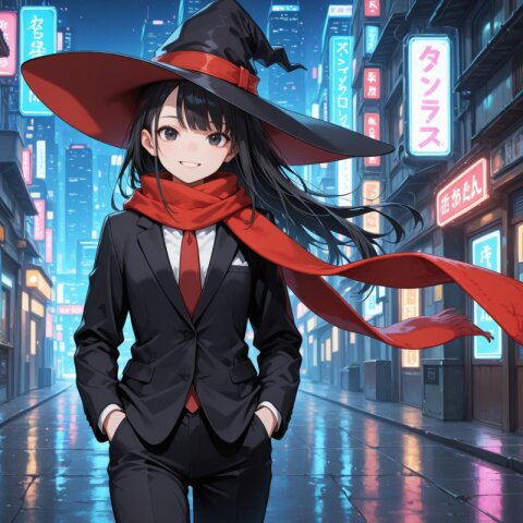 masterpiece,best quality,highres,highly detailed,detailed eyes,general,chibi,1girl,solo,17yo,(hand in pocket, holding large bouquet,black witch hat,long red scarf,grin),cute girl,slender,small breasts,very long sleeves,light smile,black hair,long hair,bangs,black eyes,Witch girl,(long black Witch cloak,long black Witch kimono robe, black obi,long black cargo pants),boots,slender girl,looking at viewer,fireworks,lantern festival,night,full body,fantasy,