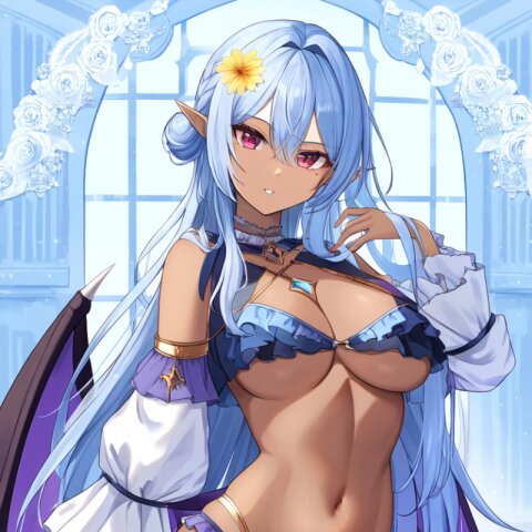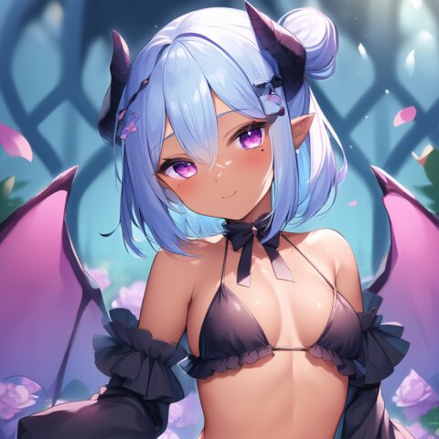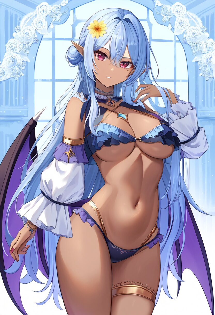 1girl, dark skin, light blue hair with a single hair bun and long flowing strands, medium breasts with a focus on underboob, and a mole under one eye. She has an androgynous charm, wearing a bikini with ruffled trim and frill sleeves. Her eyes are a captivating purple, matching her hair ornaments. The background features a flower gate, adding a magical atmosphere. She has big wings, enhancing her succubus-like appearance, and her navel is visible. Her overall look is both enchanting and cute, with a touch of fantasy., no text, best quality, very aesthetic, absurdres