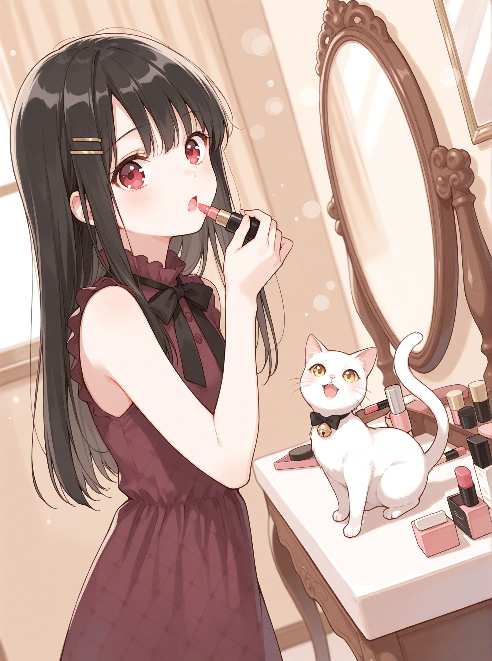 (flat color:0.1),(pale color:0.3), (tareme:0.33), cute 1girl , ruby eyes, straight hair ,black hair ,(hair between eyes:0.5), hairpin,kawaii, (pastel theme :0.5), (depth of field:0.5), (bokeh:0.8),(open mouth :0.9),(excited:0.5) ,(\:D:0.1),(\:o:0.1), (head tilt:0.7), BREAK (a cat on vanity table :1.33), cat, paw up, refined , (hand up:1.1), bowtie, dress, sleeveless_dress, unmoving_pattern, maroon_dress, applying_makeup, mirror, holding lipstick_tube , indoors, cosmetics ,( from side:0.8), ( dutch angle:0.2),(contrapposto:0.2),