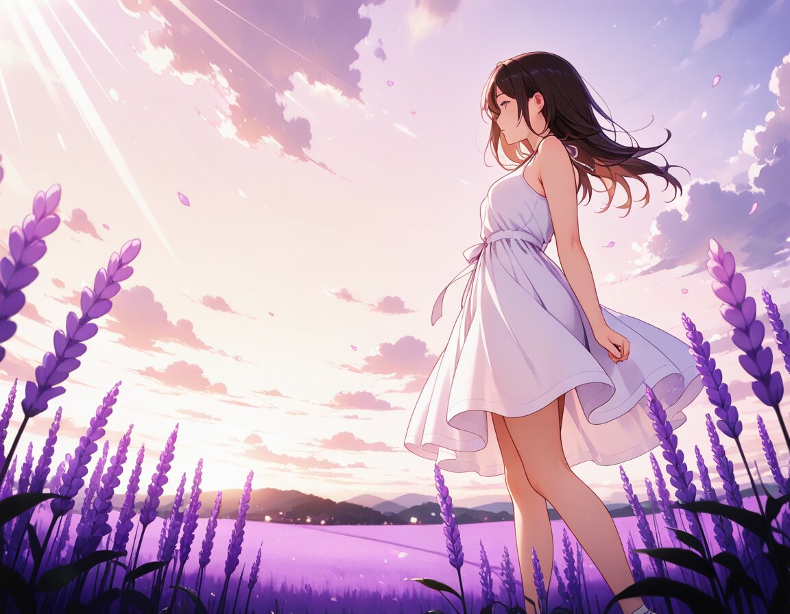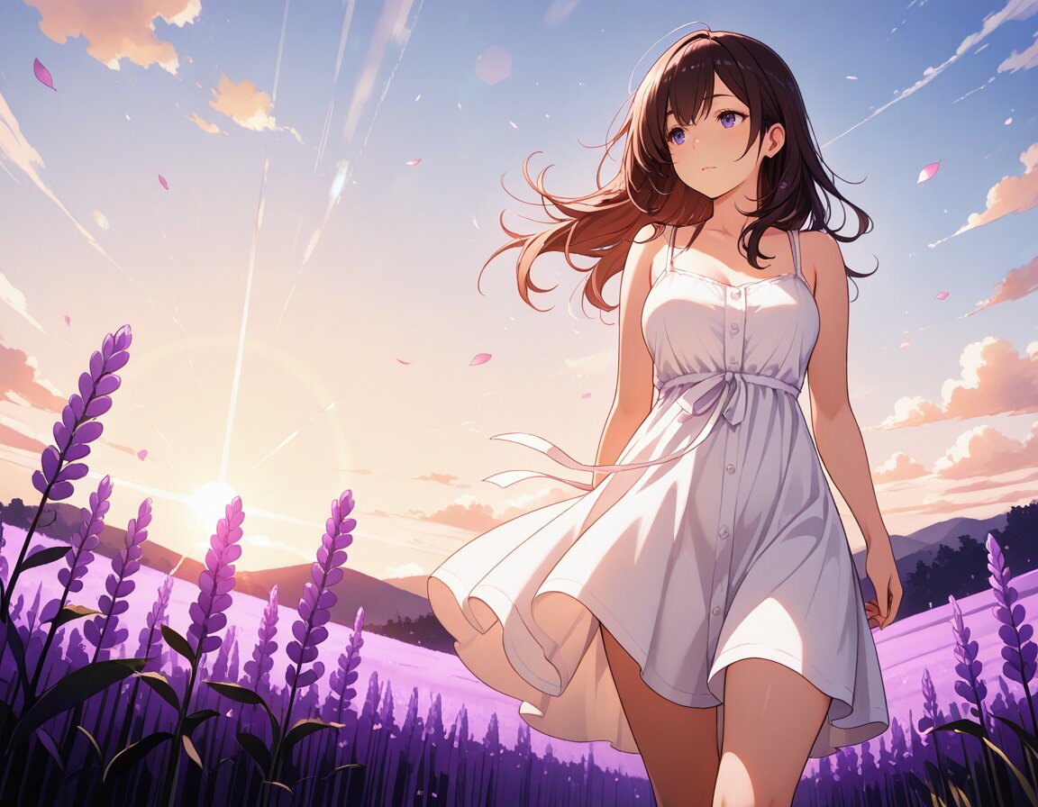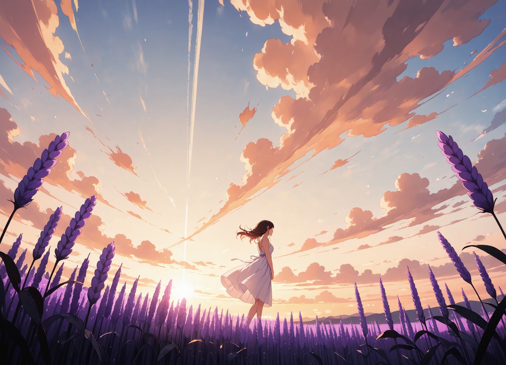 photo of a woman walking through a blooming lavender field,flowing summer dress,soft wind,cinematic lighting,golden hour sunlight,serene mood,award winning,bokeh,helios 85mm,dof,trending on artstation, general,safe,from side,from below,very wide shot,, appropriate posture,appropriate configuration,ideal ratio body proportions,perfect anatomy, <lora:Fixhands_anime_bdsqlsz_V1:1>, masterpiece, best quality, amazing quality, very aesthetic, absurdres, highres, newest