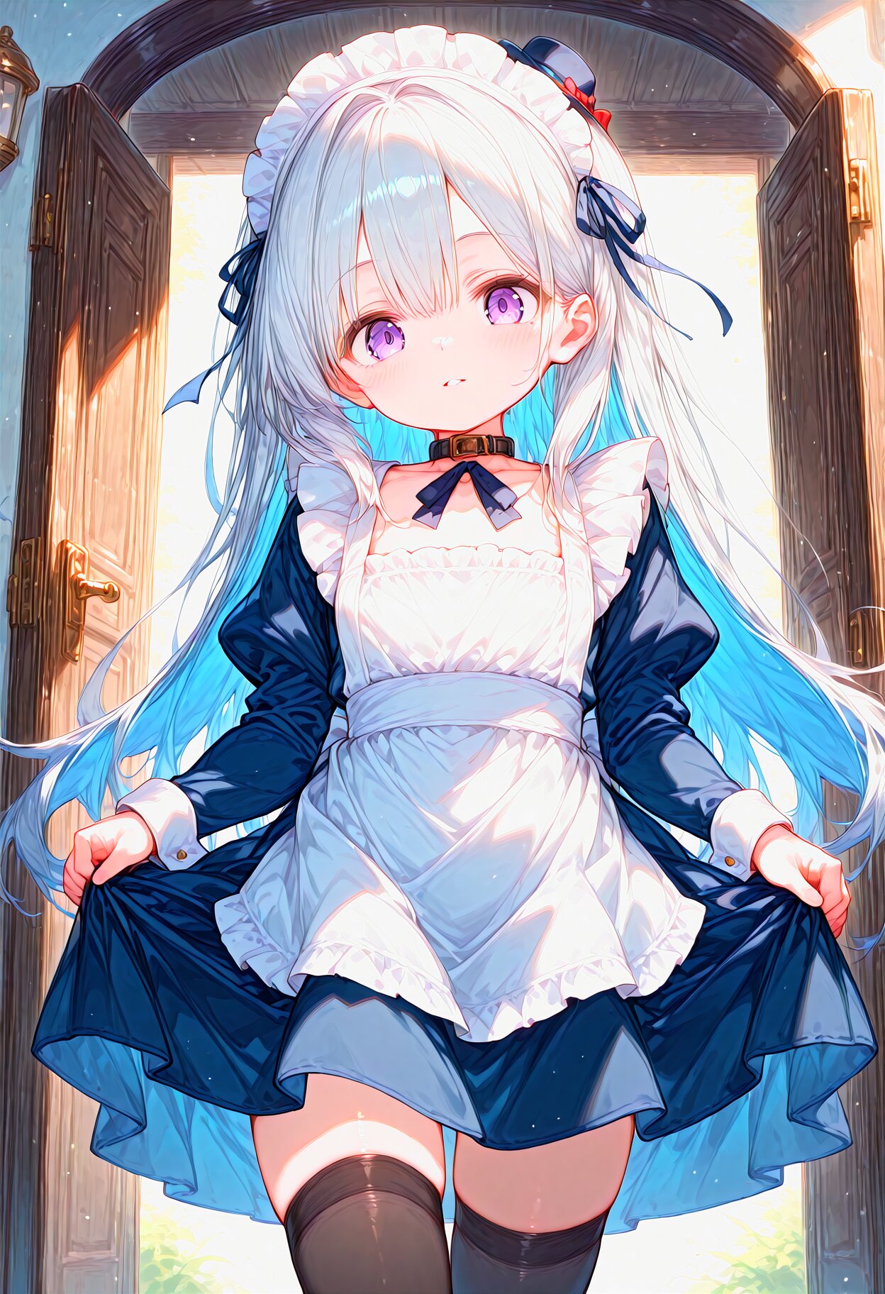beautiful detailed background, best quality, (pale color:0.5), solo, (portrait:1.1), collarbone, parted lips,(Expressionless:0.9), big eyes,(half-closed eyes:0.8), tareme, pale purple eyes, thighhighs, (silver hair:1.1), (dark blue hair colored inner hair:0.8), long hair,very long hair eyebrows visible through hair, maid,maid apron, maid headdress,blue skirt, mini hat, choker, collar, wrist cuffs, long sleeves, frills, strapping ribbon, looking at viewer, greeting, curtsey, entrance, one door,outdoors, cinematic light,, <lora:noline-16oa:-1.2> <lora:sdxl2-flat2-512b:-2.8>