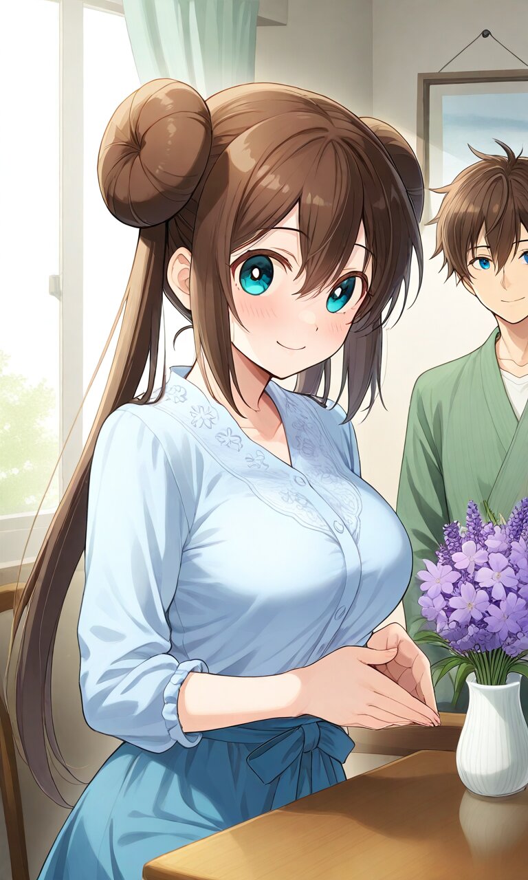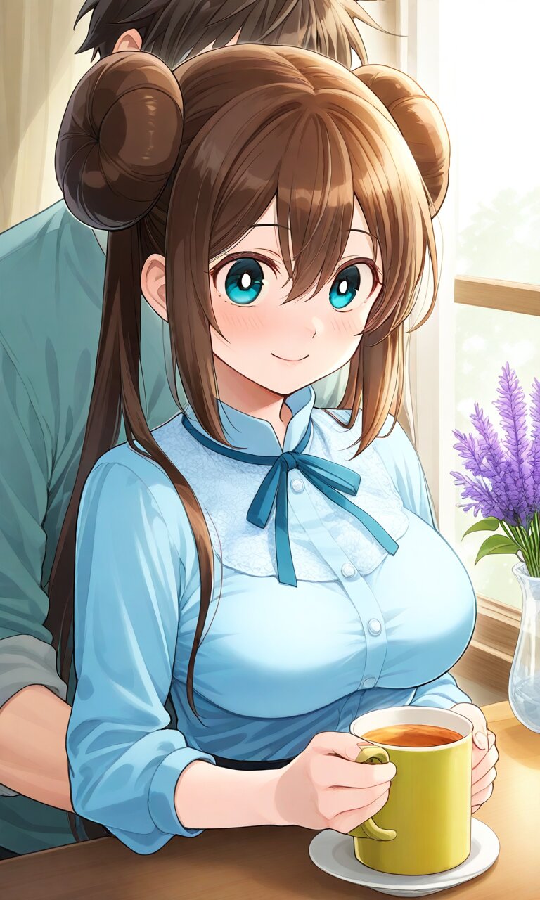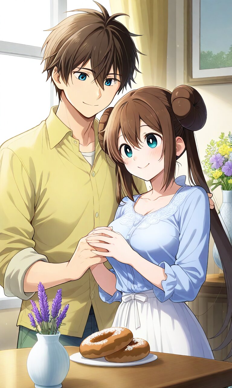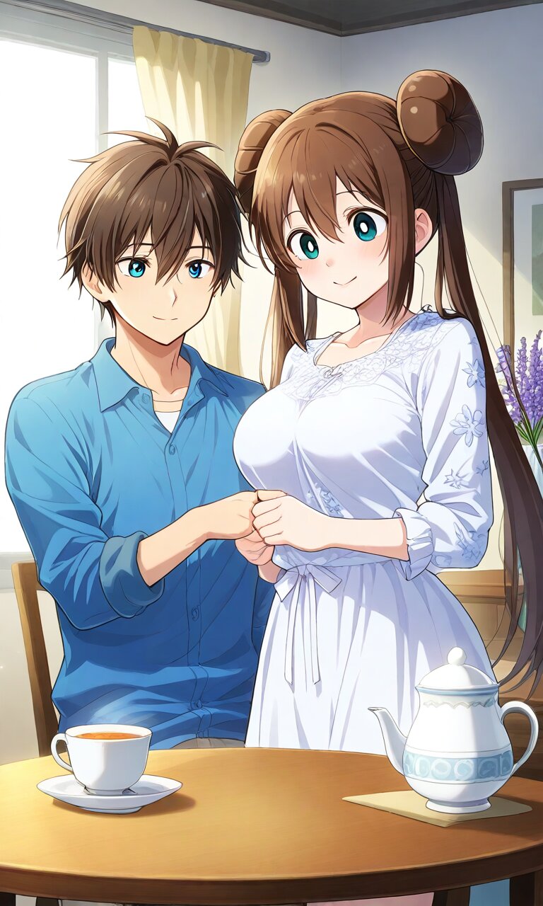 Couple, boy and girl, two people only,absurdres, ultra-detailed, master piece, high resolution, 8k, Boy, girl, two people, On a mild spring afternoon, a glass vase with a bouquet of lavender flowers is placed in the center of a wooden table with a subtle fragrance. A man and a woman sit comfortably, facing each other across the table. The man is wearing a casual shirt with the sleeves rolled up, a cup of lavender herbal tea in his hand, and a warm smile on his face as he talks to the woman. The woman, dressed in a floral blouse and skirt, listens to him and giggles occasionally as she cradles her teacup in her hands. On the table are baskets of homemade cookies and scones, and small plates of butter and jam add color. The woman takes a scone and offers half to the man, who takes it shyly, their fingers lightly touching. In the background, spring sunlight streams in through an open window, curtains sway in the room, and birds chirp in the distance. Surrounded by the scent of lavender and the warmth of herbal tea, this is the moment when the gentle bond between a man and a woman quietly resonates in the small happiness of the table. BREAK the boy(original boy,) BREAK the girl(rosa, brown hair, double bun, doughnut hair bun, hair bun, blue eyes, hair between eyes, twintails,, large breasts, ),