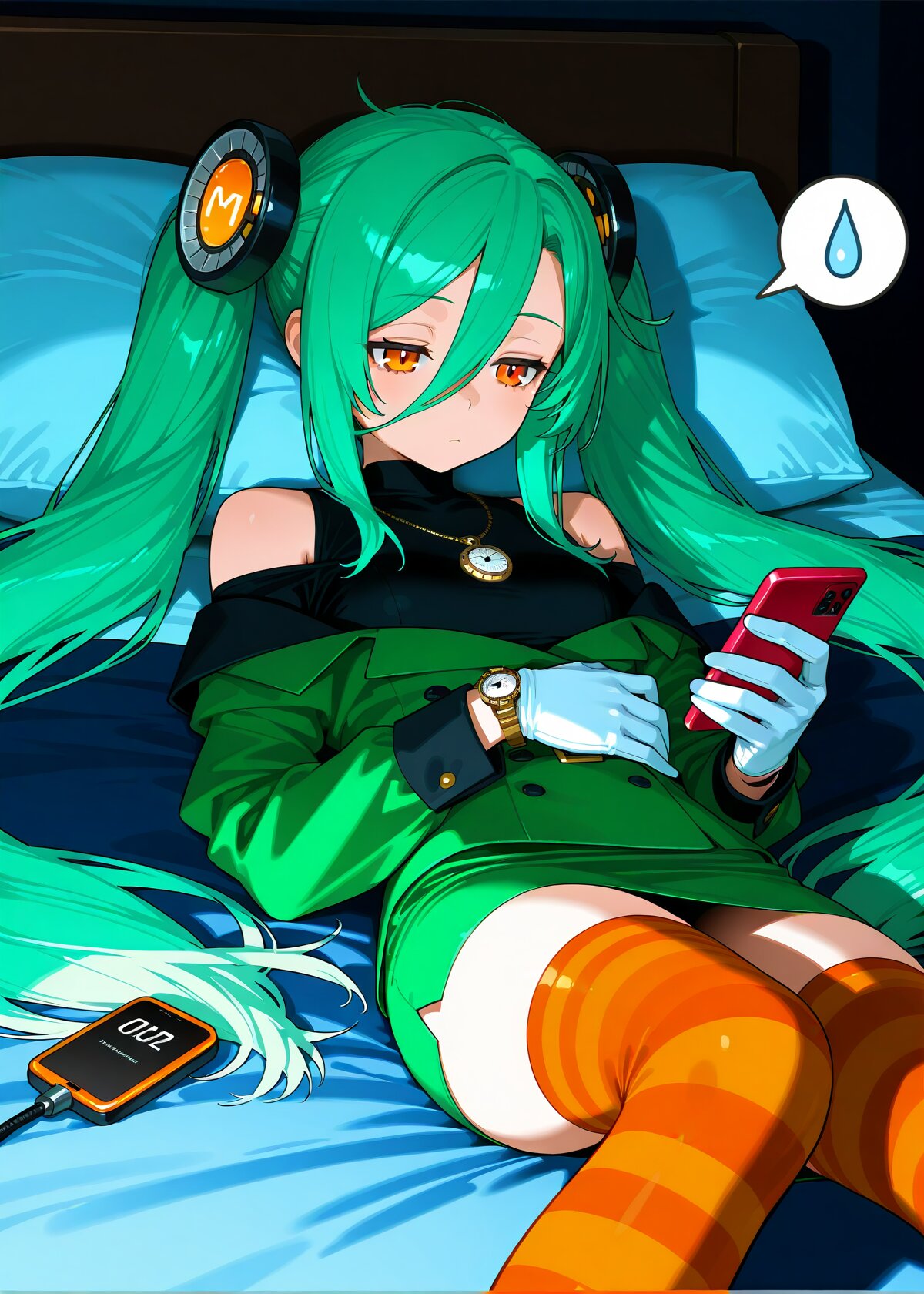 1Robots lady, solo, Prosthetic, Machine joints, Mechanical accessories, mechanical hair ornaments, orange eyes, light Green hair, very long hair, rabbit style twintails, parted bangs, long bangs, long side hair, hair between eyes, perfect center part, holding electric massagers on shoulders, department store lady, Green office lady outfit, white gloves, orange legwear, green legwear, striped legwear, mini tight skirt, big Watch hair ornament,, watches, watch necklace, department store, "1girl, off shoulders, , , , , , , , , undershirt, spoken sweatdrop, , holding smartphone, looking at phone, lying, , on back, on bed, , pillow, , , , solo, upper body, night, sleepy, dark room, under cover, "