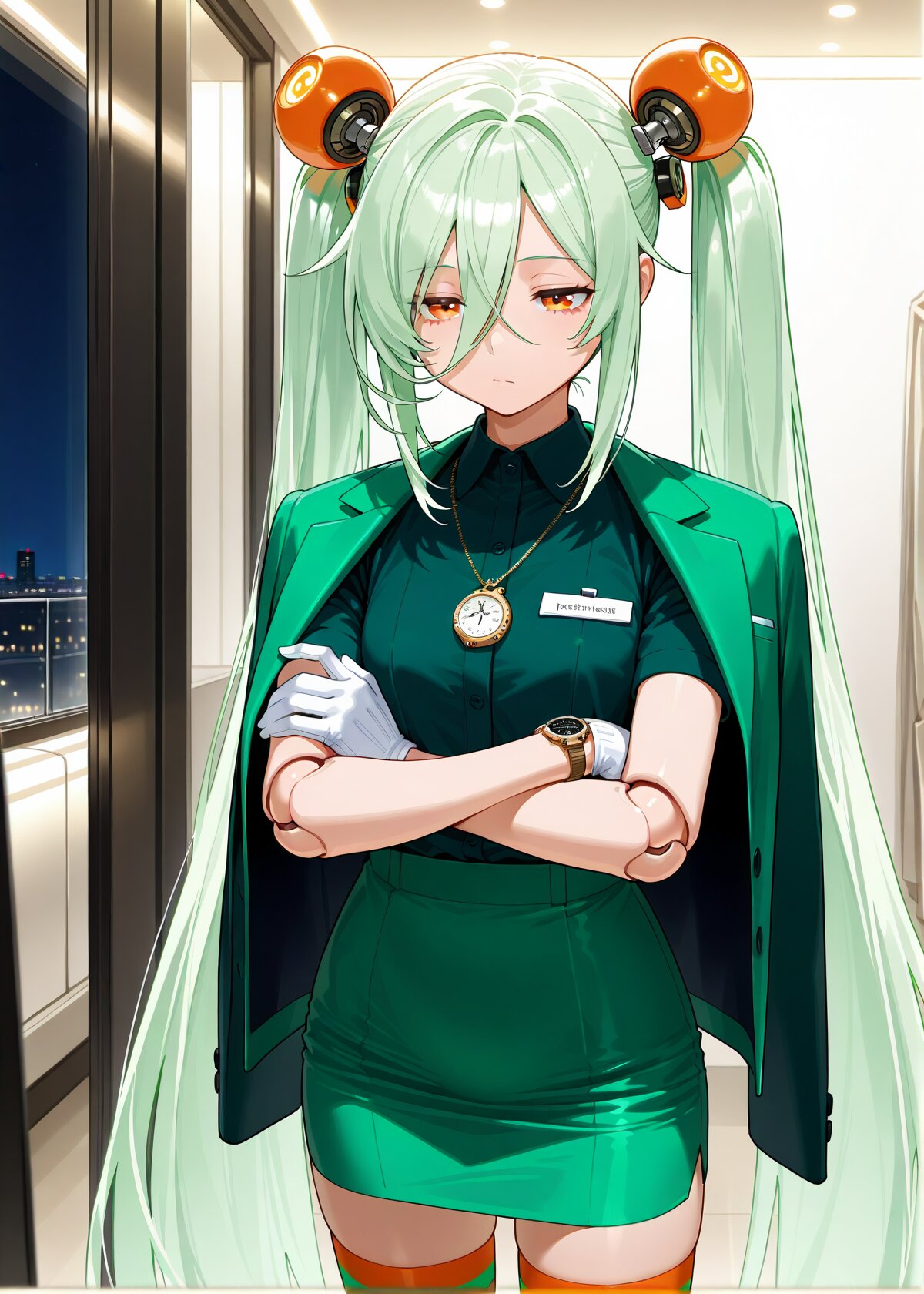 1Robots lady, solo, Prosthetic, Machine joints, Mechanical accessories, mechanical hair ornaments, orange eyes, light Green hair, very long hair, rabbit style twintails, parted bangs, long bangs, long side hair, hair between eyes, perfect center part, holding electric massagers on shoulders, department store lady, Green office lady outfit, white gloves, orange legwear, green legwear, striped legwear, mini tight skirt, big Watch hair ornament,, watches, watch necklace, department store, 1view, solo, sleepy, close mouth, crossed arms, 腕を組む indoors, girl's room, night,