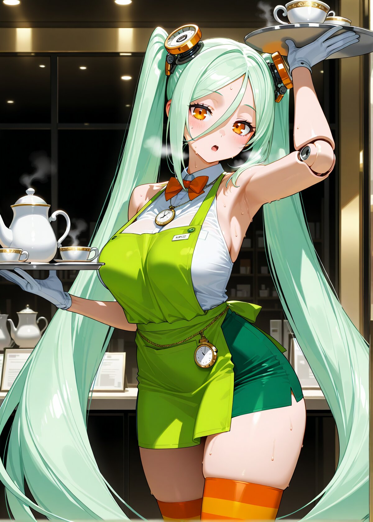 1Robots lady, solo, Prosthetic, Machine joints, Mechanical accessories, mechanical hair ornaments, orange eyes, light Green hair, very long hair, rabbit style twintails, parted bangs, long bangs, long side hair, hair between eyes, perfect center part, holding electric massagers on shoulders, department store lady, Green office lady outfit, white gloves, orange legwear, green legwear, striped legwear, mini tight skirt, big Watch hair ornament,, watches, watch necklace, department store, "apron, arm up, armpits, bare shoulders, , blush, breasts, breath, , cup, holding tray, japanese clothes, , looking at viewer, open mouth, eyes, saucer, solo, steam, sweat, tea, teacup, teapot, thighs, tray. bowtie, coverd breasts, girl focus, " indoors,