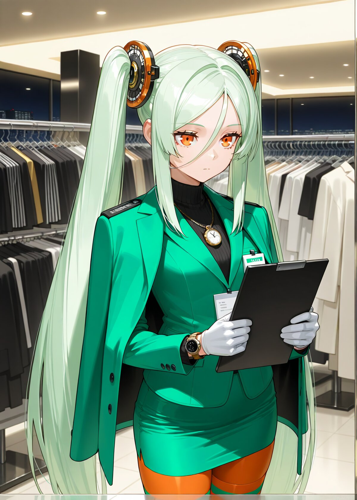 1Robots lady, solo, Prosthetic, Machine joints, Mechanical accessories, mechanical hair ornaments, orange eyes, light Green hair, very long hair, rabbit style twintails, parted bangs, long bangs, long side hair, hair between eyes, perfect center part, holding electric massagers on shoulders, department store lady, Green office lady outfit, white gloves, orange legwear, green legwear, striped legwear, mini tight skirt, big Watch hair ornament,, watches, watch necklace, department store, indoors, expressionless:1.5, night,