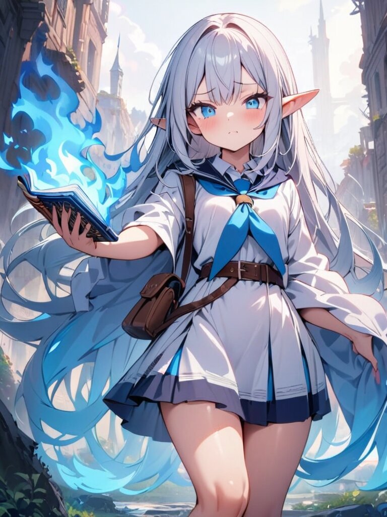masterpiece, best quality, high resolution,detailed eyes, BREAK, 1girl ,standing , looking at the viewer,, cute, kawaii, elf,blue eyes,silver straight hair,long hair, squinting, from front, BREAK, fusion of long witch robe and school uniform,white shirt,(blue necktie),leather waste pouch,mini skirt, full body shot, (holding a magic book with left hand:1.4), outstretched right arm, (magic circle behind her), (hand on blue fire), (fantasy video game character), (magical effect background), <lora:Dreamyvibes artstyle SDXL - Trigger with dreamyvibes artstyle:1>