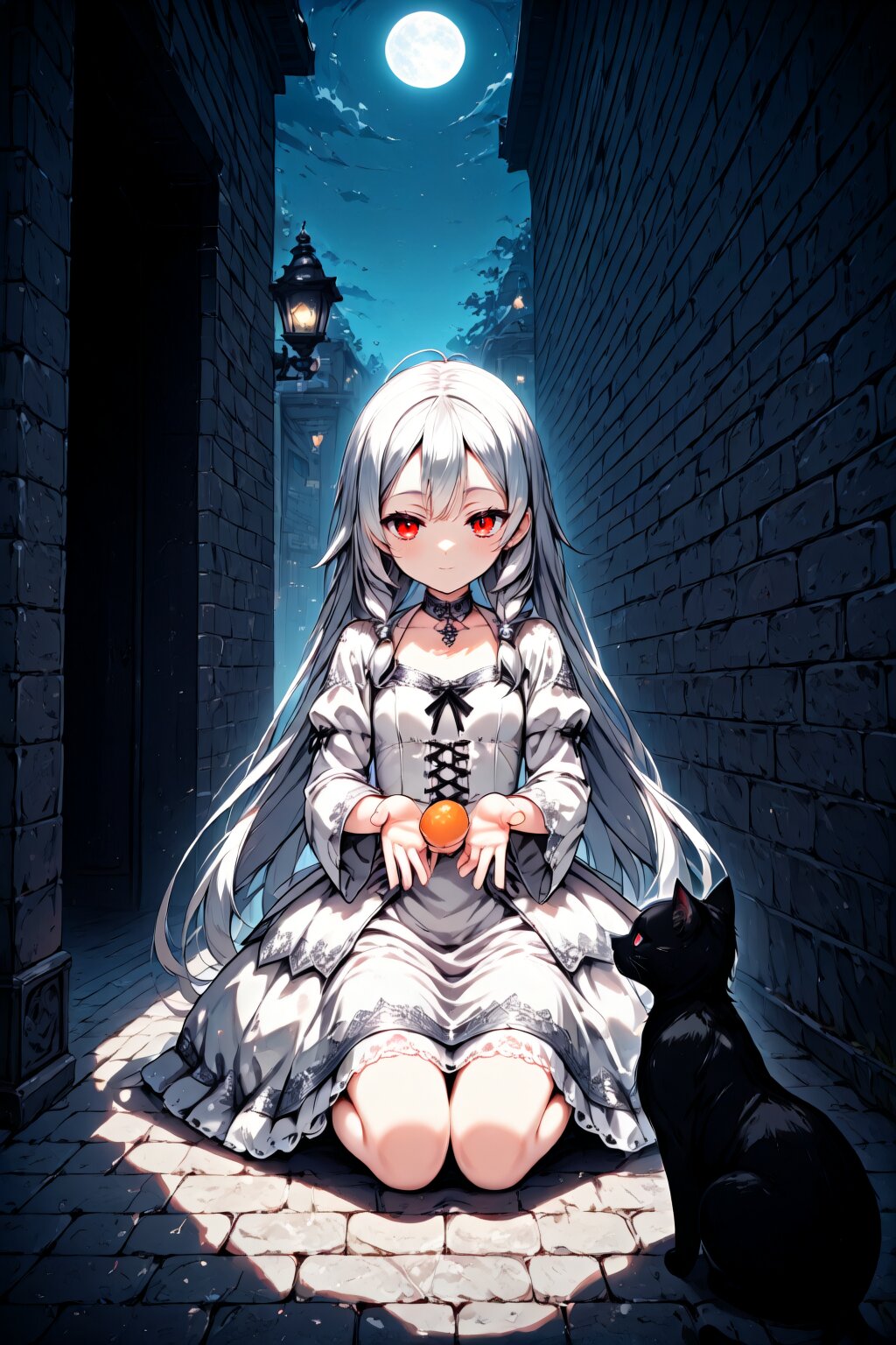 1girl, himuro kochou, petite stature, slender build, silver white long straight hair, waist-length hair, small side braids, deep crimson eyes, sharp eyes, elegant gothic lolita dress, black and silver dress, feeding black cat, alleyway, bar back entrance, moonlight, night scene, gentle expression, rare smile, kneeling pose, soft hand gesture, stone pavement, urban background, brick wall, warm intimate moment, dignified aura, porcelain-like skin, highres, masterpiece, best quality
