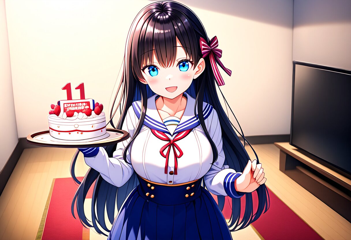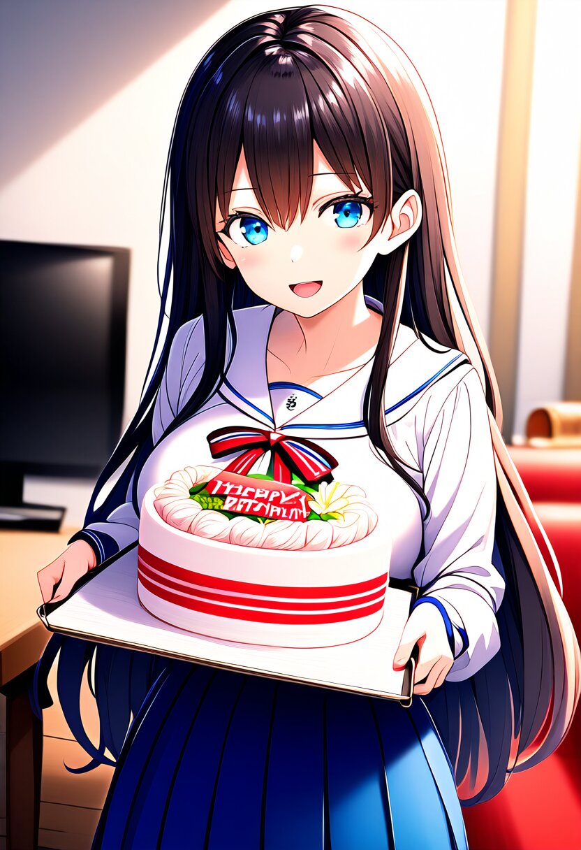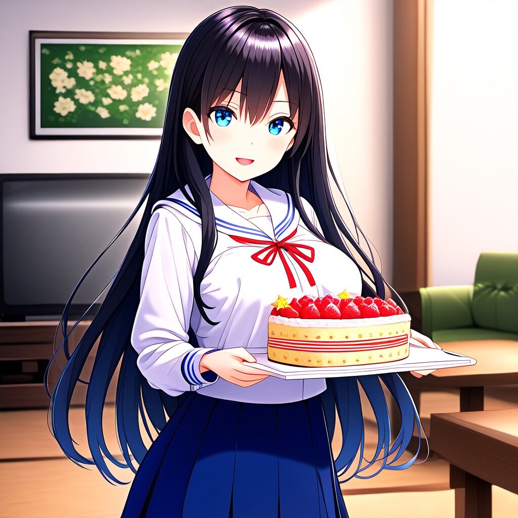 {{{masterpiece}}}, {{{best quality}}}, {{{very aesthetic}}}, {{{ultra-detailed}}}, {illustration}, {{{extremely detailed}}}, {{{an extremely delicate and beautiful}}}, {{{highly detailed}}}, {{official style}}, {{game cg}}, 1girl, solo, style of ai-generated, {{tenka hyakken, girlfriend (kari)}}, 1girl, solo, blue eyes, very long hair, black hair, hair between eyes, large breasts, happy, light smile, open mouth, {{{white sailor suit, red sailor ribbon, long sleeves, blue skirt}}}, {{{{{holding a tray, birthday cake}}}}}, cowboy shot, standing, living room, tv, sofa, table, facing the front, looking at viewer, straight-on, close to viewer, solo focus, no human
