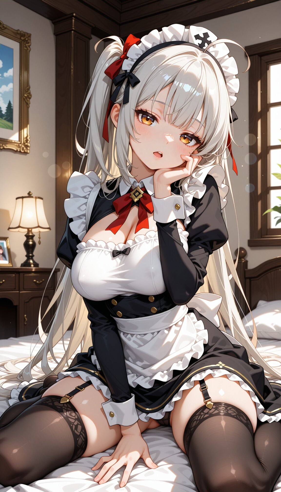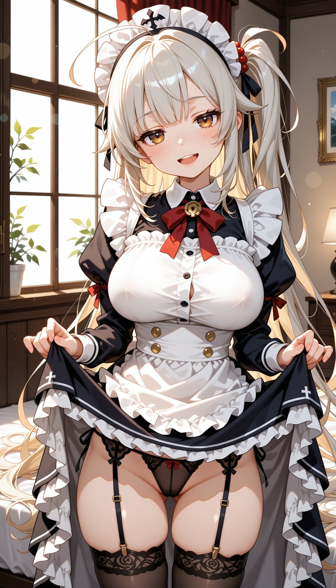 1girl, solo, ahoge, absurdly long hair, side ponytail, gray hair, brown eyes, jitome, upper teeth only, (botan gap:0.8), medium large breasts, (head tilt), real skin, traditional maid,long skirt,long sleeves, (black thighhighs,zettai ryouiki,skindentation),(garter,garter belt,garter strap), maid headdress, __Advanced/posing__, __ bedroom, window, panty peek, crotch seam