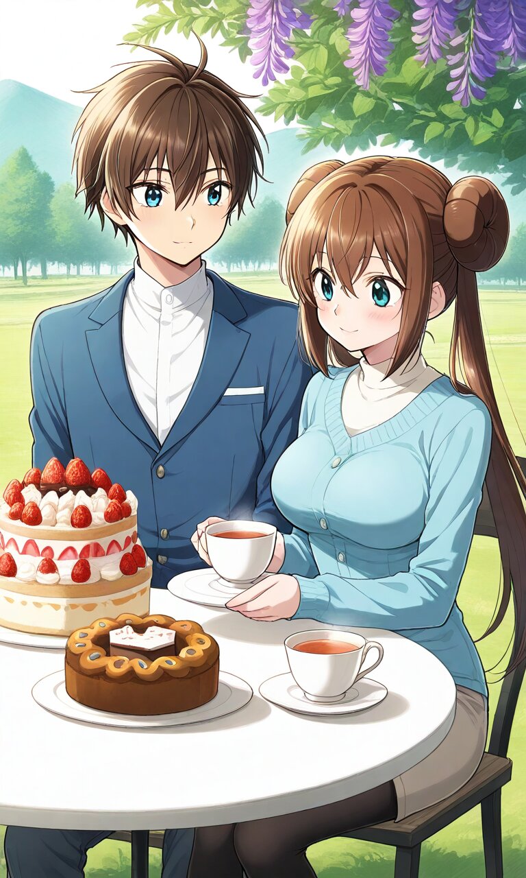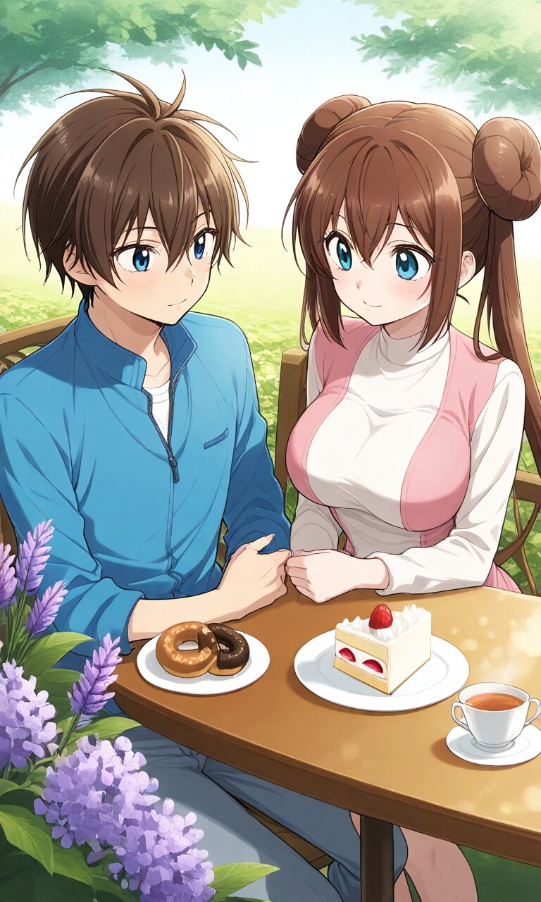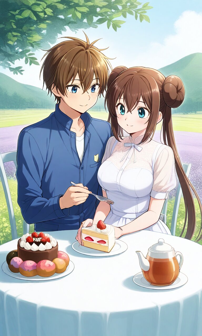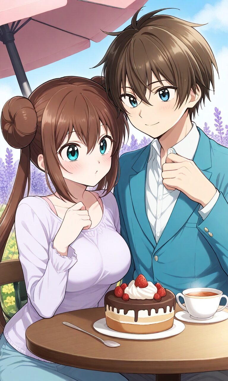 Couple, boy and girl, two people only,absurdres, ultra-detailed, master piece, high resolution, 8k, Boy, girl, two people, outdoors, lavender field, tea time, table, cake BREAK the boy(original boy,) BREAK the girl(rosa, brown hair, double bun, doughnut hair bun, hair bun, blue eyes, hair between eyes, twintails,, large breasts, ),
