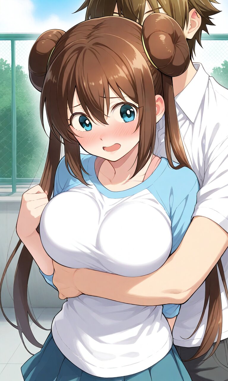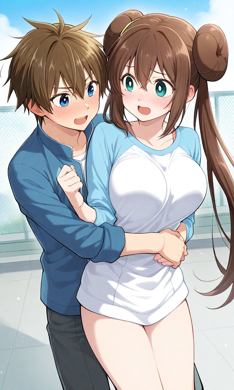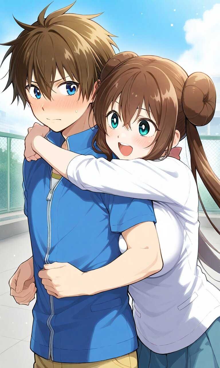Couple, boy and girl, two people only,hug from behind, School rooftop, embarrassed laugh. BREAK the boy(original boy,) BREAK the girl(rosa, brown hair, double bun, doughnut hair bun, hair bun, blue eyes, hair between eyes, twintails,, large breasts, ),