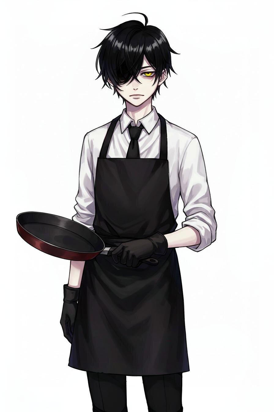A realistic full-body illustration of a boy with black hair, with hair covering one of his eyes, yellow eyes, wearing a white dress shirt, a black apron, and black gloves. He has a completely expressionless face — no smile, no emotion. He is holding a frying pan in one hand, standing in a composed posture, showing no interest or engagement in the activity. His eyes are blank and his face shows no reaction, as if cooking is just another meaningless task.