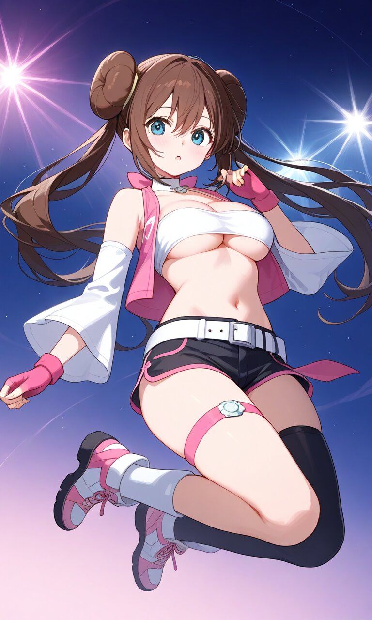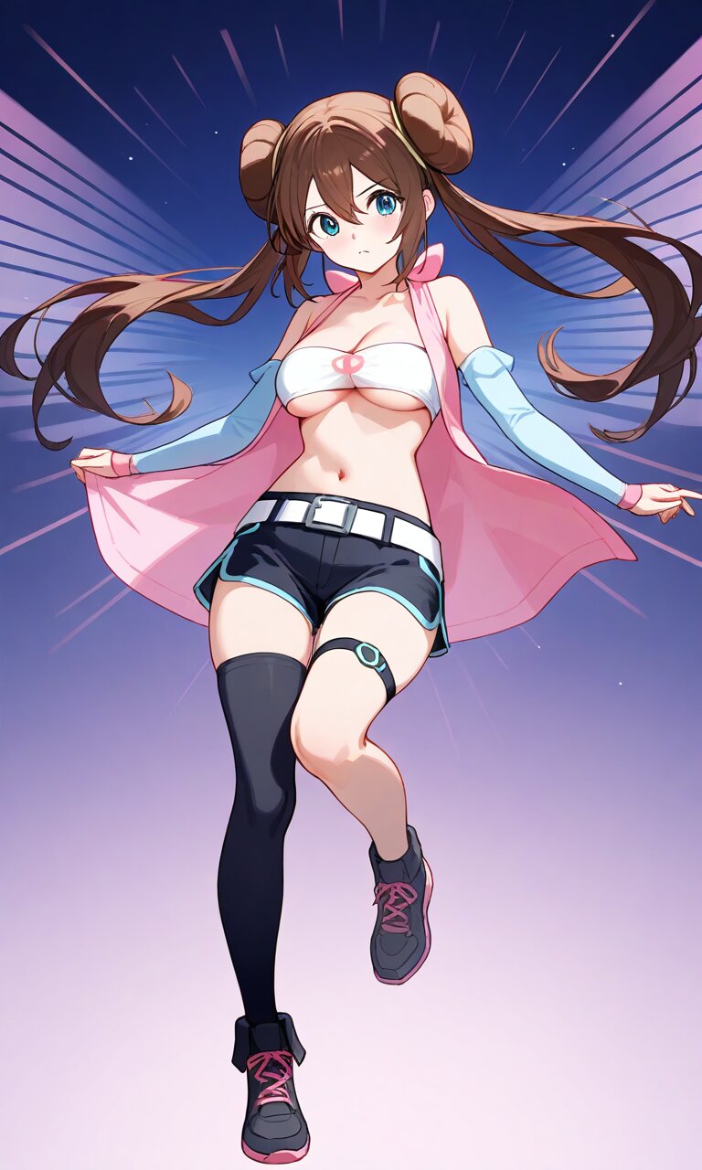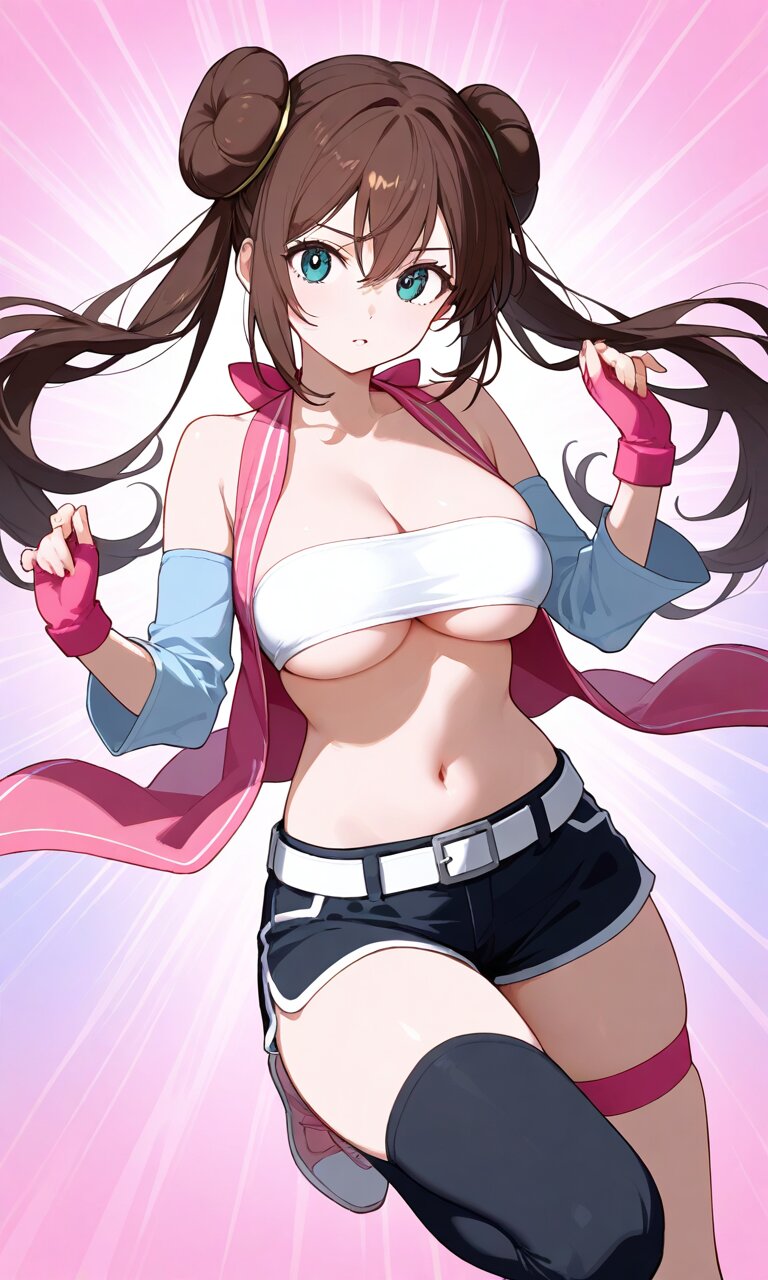 rosa, brown hair, double bun, doughnut hair bun, hair bun, blue eyes, hair between eyes, twintails, large breaths best quality}, {very aesthetic}, {ultra-detailed}, {best illustration} nsfw, perfect hands, perfect face, perfect eyes, perfect light, dynamic light, natural light, full body cleavage, white bandeau, underboob, bare shoulders, pink vest, open vest, detached sleeves, pink fingerless gloves, black short shorts, white belt, black single thighhighs, thigh strap