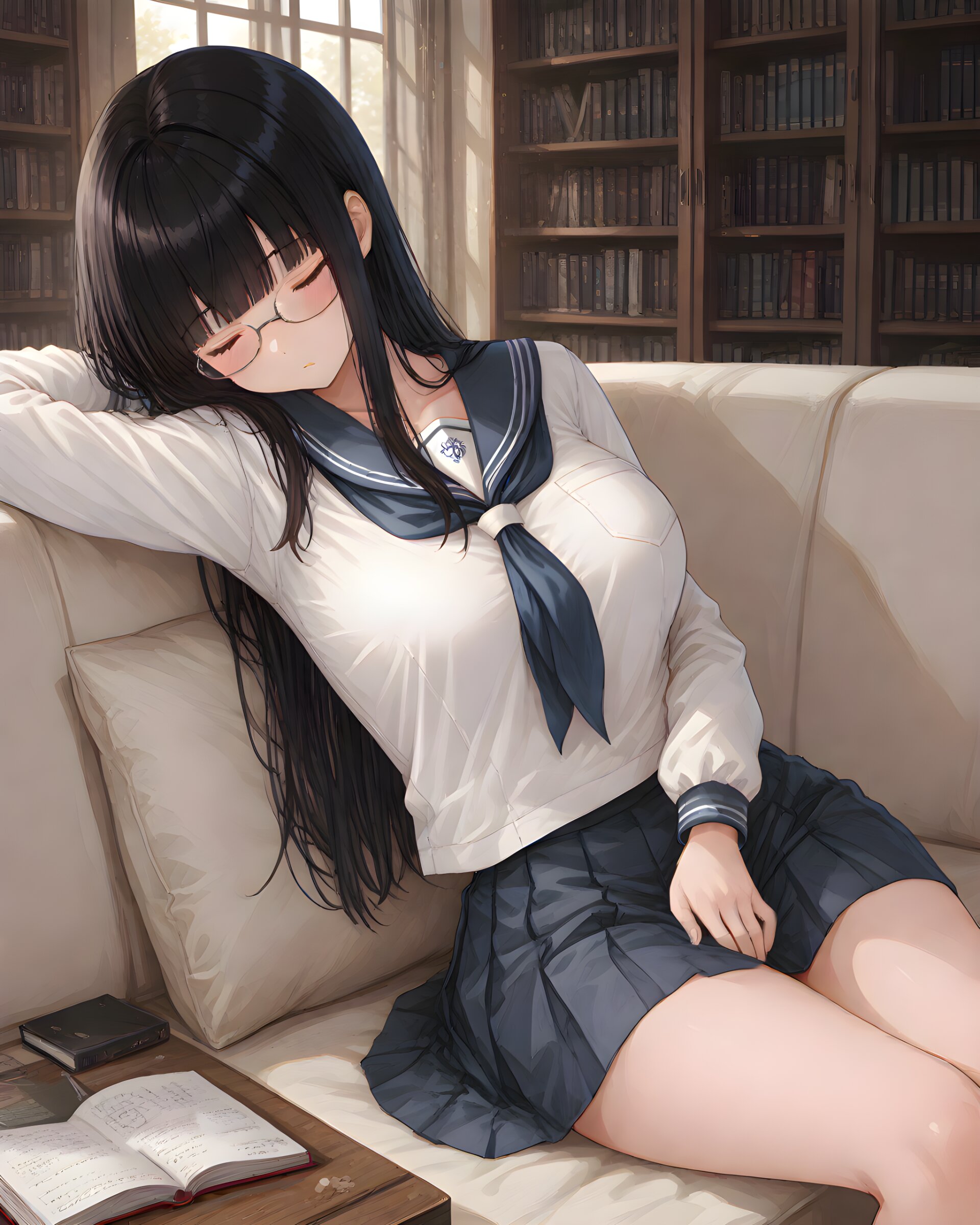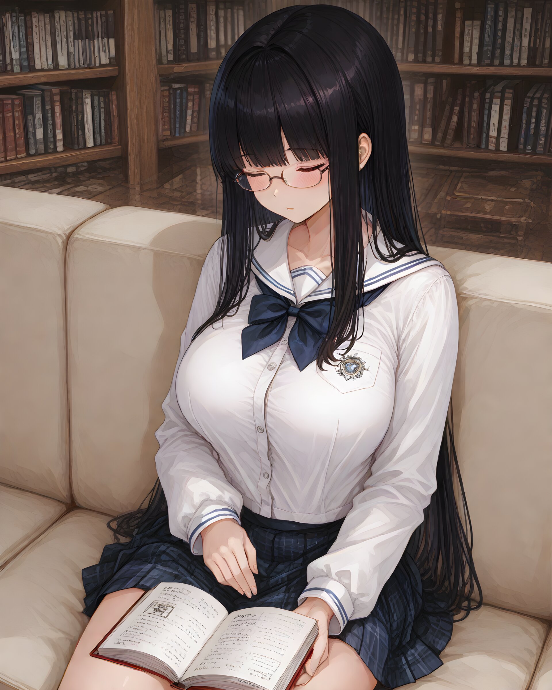 <lora:hyper_sdxl_8_step_lora_f16:1>,, 1girl, sleeping, sitting sofa, library, book, day, BREAK 18 years old, girl, long straight black hair, blunt bangs, large breasts, school uniform, se-ra Fuku, glasses, blush, BREAK masterpiece, amazing quality, best quality, ultra-detailed, 8K, newest, Japanese,