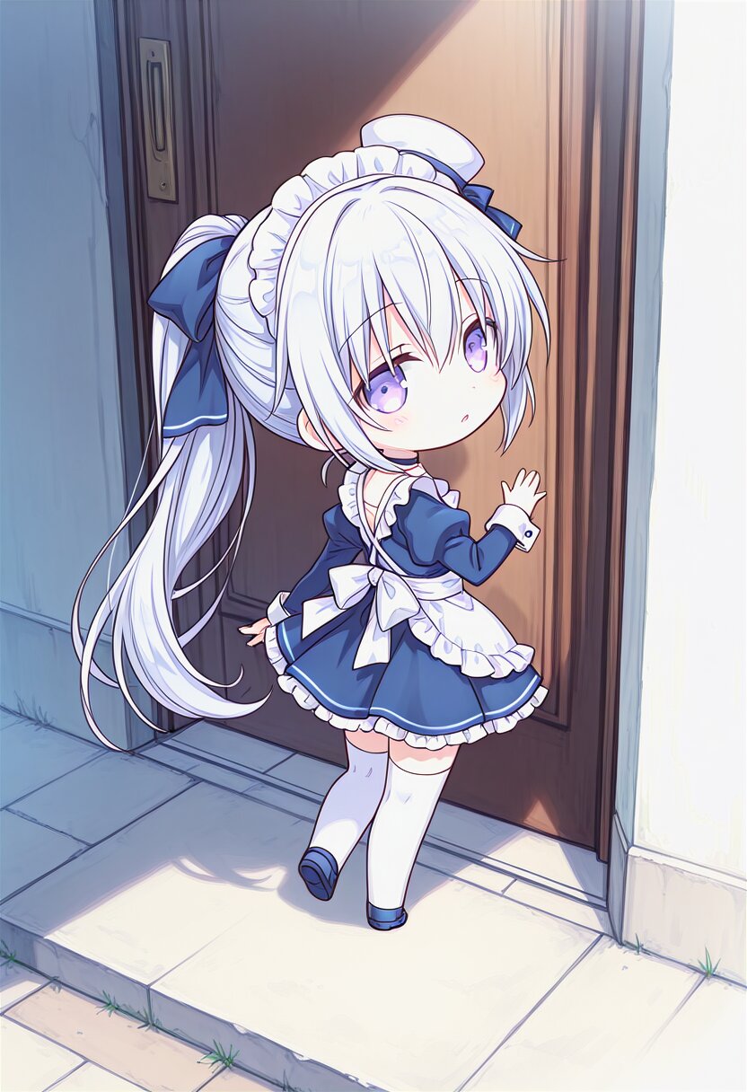 best quality, (pale color:0.7), pastel colors, full body, portrait, simple background, solo, (chibi), (chibi girl:1.2), collarbone, parted lips,(Expressionless:0.8), (half-closed eyes:0.8), pale purple eyes, tareme, (silver hair:1.1), long hair,very long hair,ponytail, eyebrows visible through hair, maid,maid apron, maid headdress,blue skirt, (mini hat,:1.1) choker, collar, wrist cuffs, long sleeves, frills,,blue ribbon, thighhighs, (waved:1.1),hand up, entrance, outdoors, looking up, (looking back,:1.1) looking at viewer, <lora:noline-16oa:-1.1> <lora:chibi_paru:-1.3> <lora:sdxl2-flat2-512b:-1.1>
