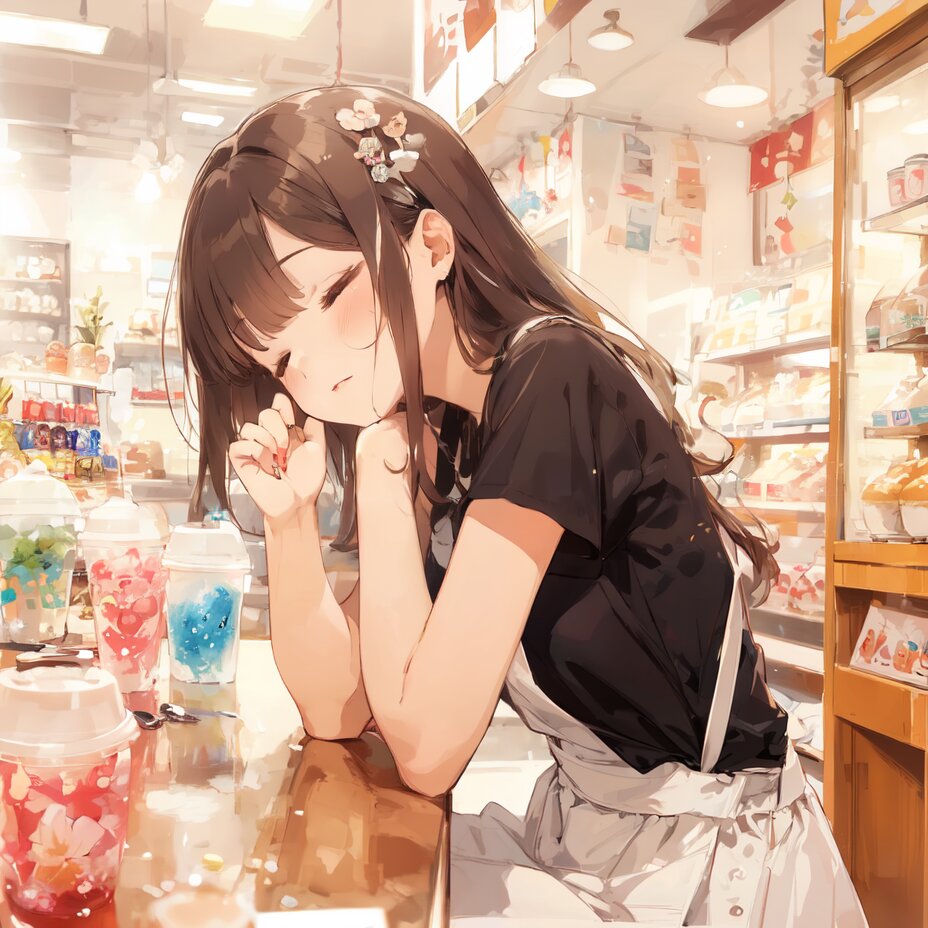 ((4fingers)), ((perfect fingers)), masterpiece, best quality, 1pretty girl who attracts customers to come inside a shop, kawaii, sleeping face, coffee shop, Ramune, perfect hands, perfect fingers
