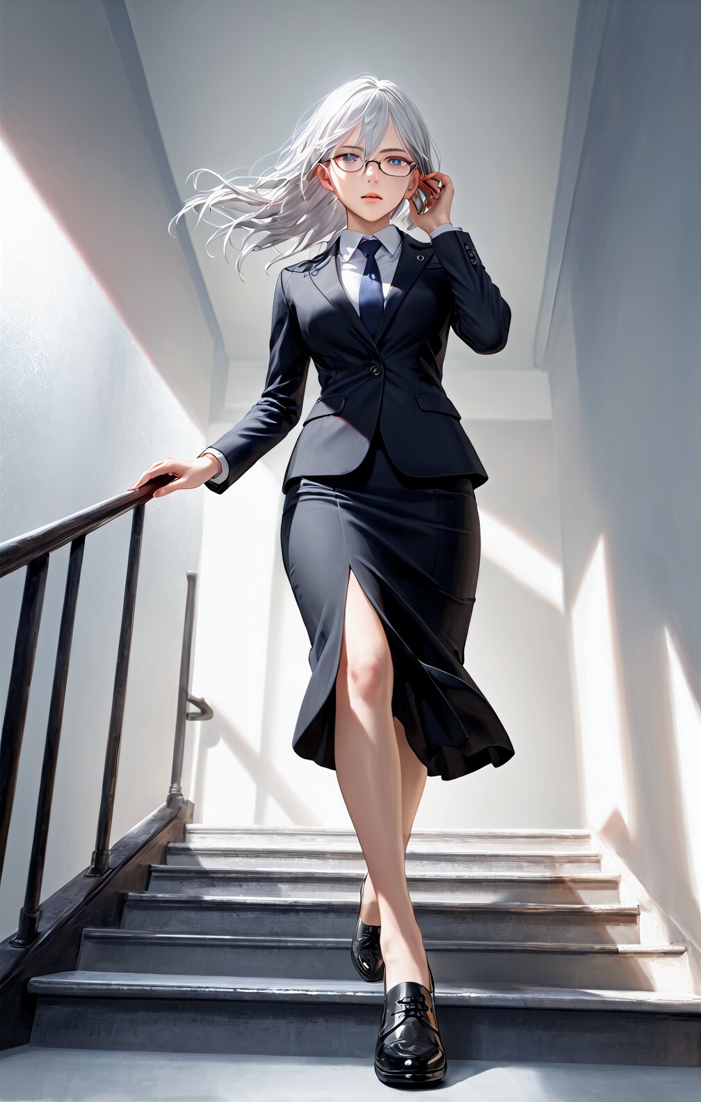 ((extremely detailed CG,ultra-detailed, high resolution,best quality, perfect anatomy,)) (photorealistic,Anglo-Saxon,) 1woman, full body, secretary, darkgray suit, long skirt, necktie, heavy makeup, lightgray eyes, booty, long straight white hair, slender, walking watching wrist watch, ((mole,)) mole under eye, name plate, typing keybord, close up, mouth focus, ((from front,)) office, strong light cooming in, dynamic lighting, dynamic shadow, dynamic pose, dynamic angle, <lora:add-detail-xl:0.61> portrait, <lora:DetailedEyes_V3:0.66> detailed eyes, <lora:legs_detailed_2.0:0.66> detailed_legs, legs, <lora:DetailedPerfect_hands_r1:0.63> detailed hands, perfect hands, solo, fingernails, realistic, semi-realistic hands, gradient, palms, outstretched hand, fingers <lora:HandOnOwnEar_pdxl_Incrs_v1:0.69> hand on own ear, long sleeves, hand up, hair tucking, hair between eyes, jewelry, adjusting hair <lora:under_rim_glasses_metal-frame_SDXL_V1:0.6> square_under_rim_glasses_metal-frame, <lora:wind-leftside-v1-wasabiya:0.65> sidewind, floating hair <lora:wind-upwind-v2-wasabiya:0.67> upwind, cloud, wind lift, floating hair, <lora:wind_lift:0.66>