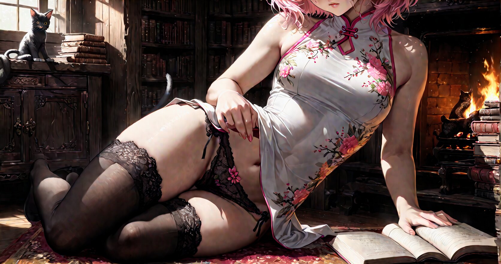 ((extremely detailed CG unity 8k wallpaper,delicate facial features, ultra high res, extremely detailed eyes and face, perfect anatomy:1.2,super fine illustration,)) ((eating hamburger,nom hamburger,two hands,burger in mouth,)) 1woman,solo,full makeup,full body,detailed pink very short hair,straight hair,detailed yellow eyes,botanical gold tattoo, (white sleeveless high slit long china dress,long qipao,see through clothes,botanical embroidery clothes,) cyberpunk,sf,mechanical body,exposed inside mechanism,finished product,white main musculoskeletal group exposed,blue mechanical joint exposed,black artificial organs visible see through the gap exposed,body and joint inside emit light,exposed wired,red cable conect body sockets,pin heels, wariza, from behind, looking back, large barcode printed legs,large QR code printed arm,long printed body, cat ears, <lora:DetailedEyes_V3:0.66> detailed eyes, <lora:add-detail-xl:0.61> misc, <lora:robolady:0.81> robotlady <lora:robo_toyo:0.75> no humans, science fiction, scenery, blurry, industrial pipe, cable, realistic, robot, ground vehicle, motor vehicle, vehicle focus, english text, ceiling light, light, mecha, depth of field, ceiling, solo, still life <lora:circle-glasses_v1.1:0.67> circle-glasses, glasses, round_eyewear <lora:BackTattooLORA:0.66> baack tattoo, <lora:bangs_pinned_back-xl-pony-v1-000008:0.69> breasts, blush, bangs pinned back, forehead, holding hair