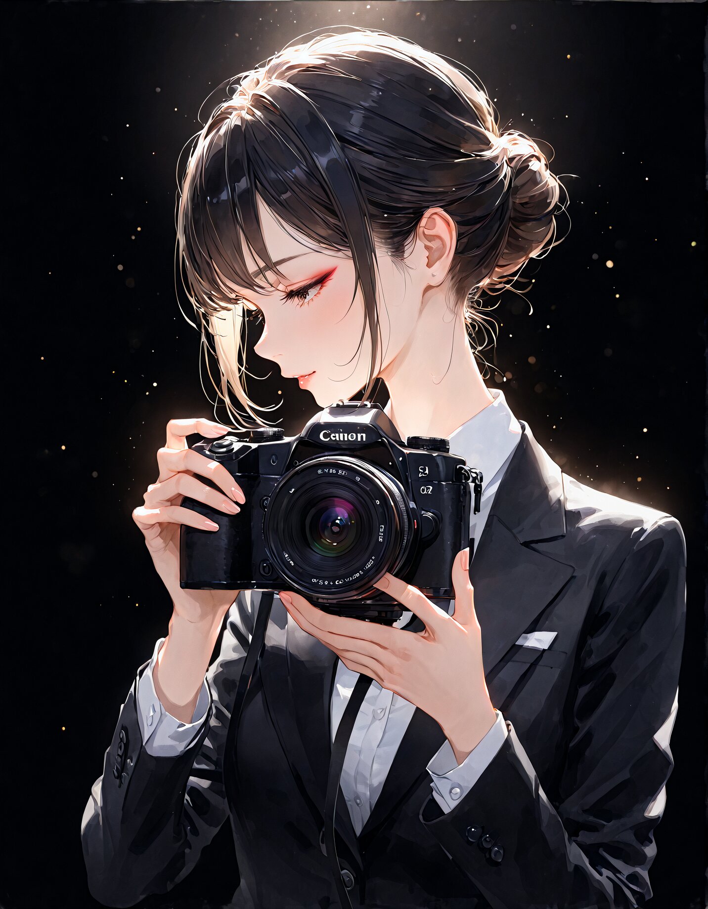 perfect anatomy, detailed SLR camera, watercolour, 1woman, holding SLR camera, solo, profile, black suit, black nektie, white collared shit, upper body, simple background, streaked hair, updo, slender, makeup, cinematic lighting, bokeh, <lora:holding_camera2_d16:0.66>holding camera, holding camera both hands, holding camera vertically, <lora:DetailedPerfect_hands_r1:0.63> detailed hands, perfect hands, solo, fingernails, gradient, palms, outstretched hand, fingers