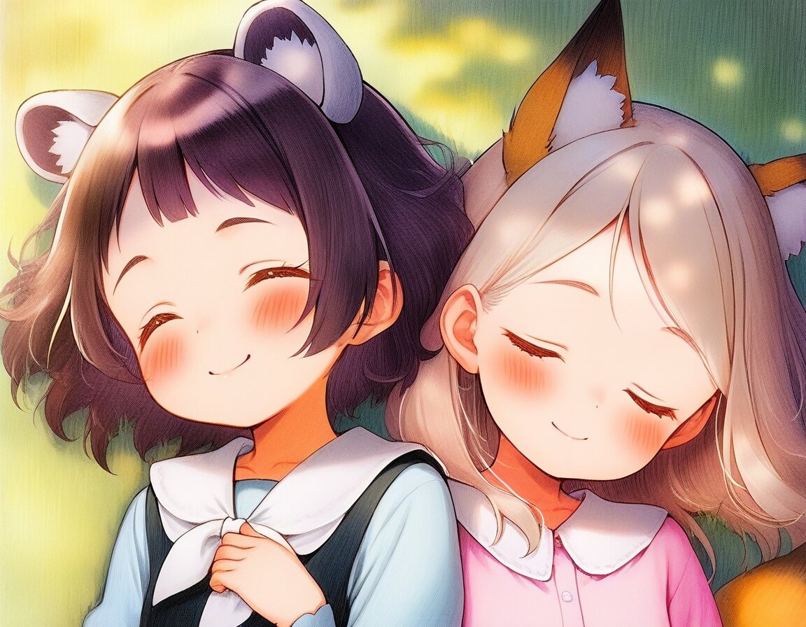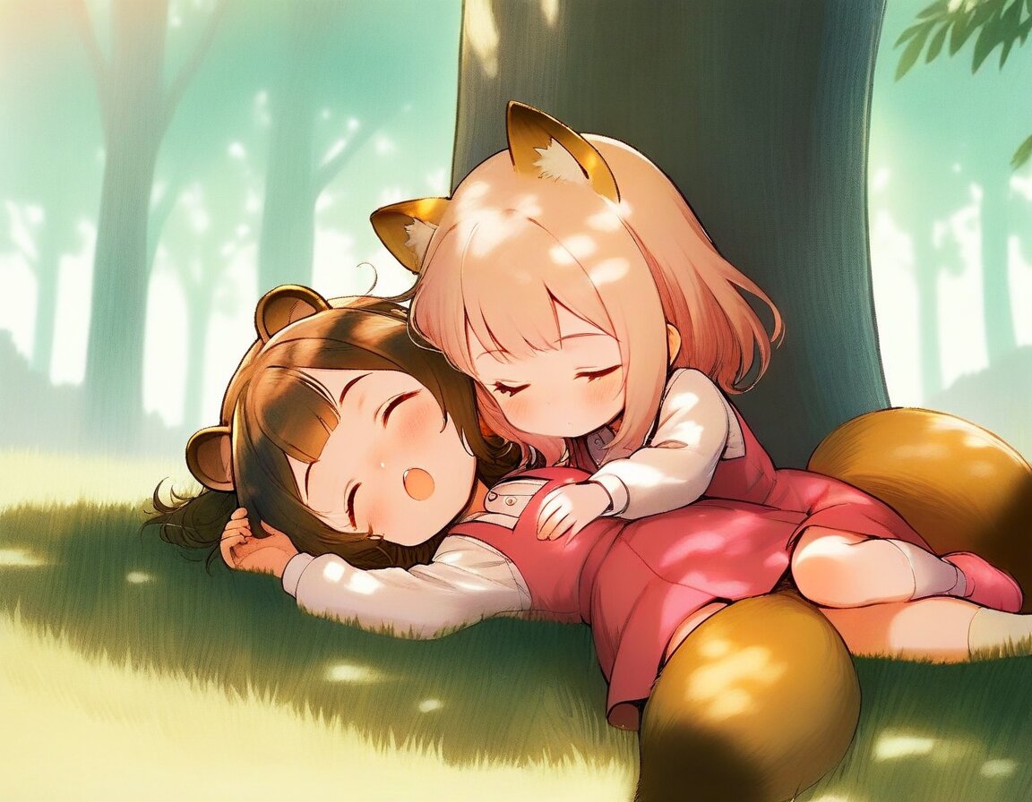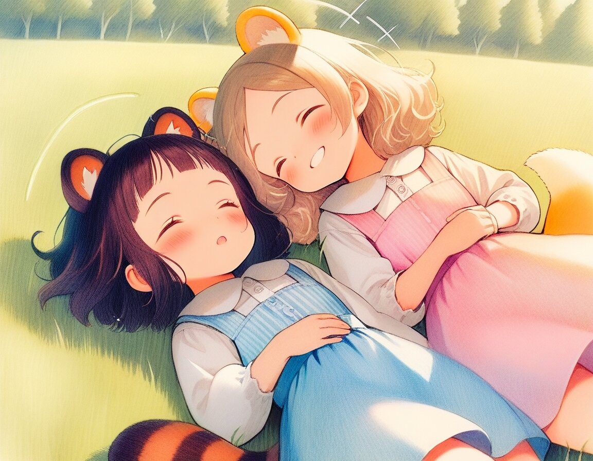 2girls, loli, mid, general, (oyari ashito:0.1), (barasui:0.1), traditional media, picturebook-style, (colored pencil drawing), pastel colors, soft tone, (blurred boundaries, drawing lines, Paper texture), cute, deformed, ultra-detailed background, (masterpiece, best quality), dynamic pose, dynamic angle, dynamic composition, close-up, Spring day, sun through the trees, shade, grass, hilltop, trees, sleeping, leaning, reclining, side by side, <lora:add_detail:1> <lora:sdxl-hairdetailer_01:1> BREAK 2girls, loli, dark brown hair, short hair, messy hair, bangs, (dark brown raccoon ears, dark brown raccoon tail with striped pattern), happy, sleeping, closed eyes, leaning on person green pinafore dress, BREAK 2girls, loli, light brown hair, medium hair, bangs, (light brown fox ears, Light brown fox tail with white tip, petite), happy, sleeping, closed eyes, leaning on person, pink pinafore dress,